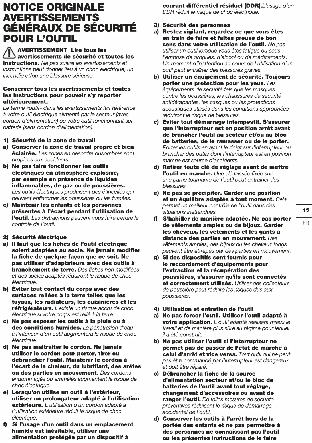 AVERTISSEMENT Lire tous les avertissements de sécurité et toutes les instructions. Ne pas suivre les avertissements et instructions peut donner lieu à un choc électrique, un incendie et/ou une blessure sérieuse. Conserver tous les avertissements et toutes les instructions pour pouvoir s’y reporter ultérieurement. Le terme «outil» dans les avertissements fait référence à votre outil électrique alimenté par le secteur (avec cordon d’alimentation) ou votre outil fonctionnant sur batterie (sans cordon d’alimentation).