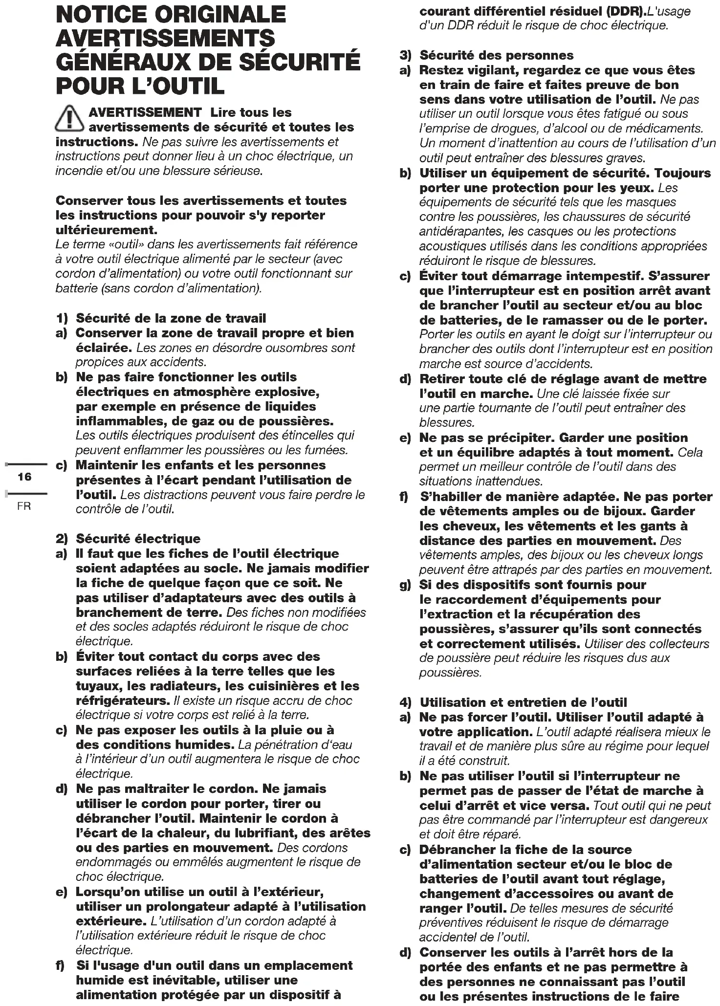 AVERTISSEMENT Lire tous les avertissements de sécurité et toutes les instructions. Ne pas suivre les avertissements et instructions peut donner lieu à un choc électrique, un incendie et/ou une blessure sérieuse. Conserver tous les avertissements et toutes les instructions pour pouvoir s'y reporter ultérieurement. Le terme «outil» dans les avertissements fait référence à votre outil électrique alimenté par le secteur (avec cordon d’alimentation) ou votre outil fonctionnant sur batterie (sans cordon d’alimentation).
