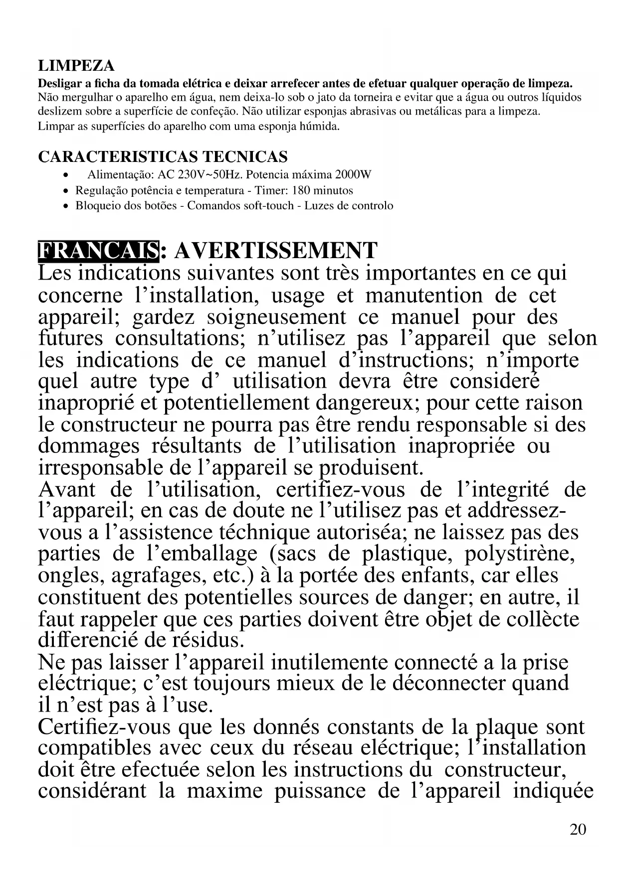 FRANCAIS: AVERTISSEMENT Les indications suivantes sont très importantes en ce qui concerne l’installation, usage et manutention de cet appareil; gardez soigneusement ce manuel pour des futures consultations; n’utilisez pas l’appareil que selon les indications de ce manuel d’instructions; n’importe quel autre type d’ utilisation devra être consideré inaproprié et potentiellement dangereux; pour cette raison le constructeur ne pourra pas être rendu responsable si des dommages résultants de l’utilisation inapropriée ou irresponsable de l’appareil se produisent. Avant de l’utilisation, certifiez-vous de l’integrité de l’appareil; en cas de doute ne l’utilisez pas et addressez- vous a l’assistence téchnique autoriséa; ne laissez pas des parties de l’emballage (sacs de plastique, polystirène, ongles, agrafages, etc.) à la portée des enfants, car elles constituent des potentielles sources de danger; en autre, il faut rappeler que ces parties doivent être objet de collècte differencié de résidus. Ne pas laisser l’appareil inutilemente connecté a la prise eléctrique; c’est toujours mieux de le déconnecter quand il n’est pas à l’use. Certifiez-vous que les donnés constants de la plaque sont compatibles avec ceux du réseau eléctrique; l’installation doit être efectuée selon les instructions du constructeur, considérant la maxime puissance de l’appareil indiquée21 sur la plaque; une installation défectueuse pourra endommager des personnes, dês animaux ou des objects, par lesquels le constructeur ne pourra pas être rendu responsable. Débranchez toujours l'appareil de l'alimentation électrique s'il est laissé sans surveillance. Au cas de necessité d’emploi d’un adaptateur, des prises multiples ou des extensions, n’utiliser que ceux qui soient en conformité aux normes de securité en vigueur; entout cas, jamais dépasser les limites d’absortion indiqués sur l’adaptateur simple et/ou sur les extensions, ni ceux de maxime puissance indiqués sur les adaptateurs multiples. Pour le nettoyage déconnectez la fiche du secteur électrique. Quand l’appareil soit hors usage et ait été décidé qu’il ne sera pas reparé, on reccomande son inutilisation, en coupant son câble d’alimentation. - Ne pas approcher le câble d’alimentation d’objects coupants ou de surfaces chaudes, et ne pas tirer sur le cordon d’alimentation pour le débrancher de la prise. Ne le laissez pas pendre du plan de travail où un enfant pourrait le tenir. - Ne pas utiliser l’appareil si le câble d’alimentation ou la fiche de connéction eléctrique sont endommagés, ou encore en cas de court-circuits; dans ce cas là, apporter l’appareil a un centre d’assistence autorisé. - L’appareil n’est pas indiqué pour être exposé à des conditions météorologiques défavorables (pluie, vent, humidité, la glace, etc.); Gardez-le dans un endroit sec. Jamais opérer ou même toucher l’appareil avec les mains mouillées ou les pieds nus. - Cet appareil peut être utilisé par des enfants agés de plus de 8 ans et par des personnes avec une réduite capacité phisique, sensorial ou mental, ou encore avec peu d’expérience à son usage, pourvu qu’une supervision22 adéquate leur en soit assuré, ou s’ils auraient été instruits à l’usage de l’appareil en complete securité. Les opérations de nettoyage e de manutention ne oivent pás être efectués par des enfants, sauf pour ceux qui sont agés de plus de 8 ans et sont supervisionés. - Gardez l’appareil et le câble d’alimentation hors la portée des enfants agés de moins de 8 ans. Si le câble d'alimentation est endommagé ou en cas de panne et / ou de dysfonctionnement, ne modifiez pas l'appareil. Toute réparation doit être effectuée par le fabricant ou par son service d'assistance technique ou, en tout cas, par une personne possédant une qualification similaire, afin d'éviter tout risque. Le non-respect de ce qui précède peut compromettre la sécurité de l'appareil et invalider les conditions de la garantie. ATTENTION: Cet appareil comporte une fonction de chauffage. Quelques surfaces, même si non la plaque elle même, pourront atteindre des températures élevées. Étant donné que la sensibilité à la température diffère de personne à personne, cet appareil devrà être usé avec PRUDENCE. Placez l’appareil sur des surfaces adéhrentes et préparées pour cet effet, et utilisez les mésures de protection contre la chaleur conseillées. - Les enfants ne doivent pas jouer avec cet appareil. - Cet appareil est destiné à être utilisé dans les ménages et des applications similaires: les cuisines du personnel dans les magasins, bureaux et autres environnements de travail, pour les clients dans les hôtels, motels et autres environnements de type résidentiel, de type lit et petit- déjeuner, hébergement. - L’appareil n’est pas conçu pour être utilisé avec une minuterie extérieure ou un commande à distance. - N’utiliser que des accéssoires e pièces d’origine. - ATTENTION: Fonctionnement à induction. Ne pas utiliser sur des tables ou des surfaces en métal.23 - Avant chaque utilisation, effectuez le cordon d'alimentation. Ne soumettez pas le produit à des chocs susceptibles de l'endommager. - Tenir l’appareil à l’écart des environnements où il peut y avoir des gaz, vapeurs, des substances inflammables ou explosives. ATTENTION, RISQUE D'INCENDIE: Ne pas utiliser pour quelque raison que ce soit sur: - tables ou surfaces métalliques - plaques de cuisson ou poêles - réfrigérateurs et congélateurs dans le cockpit - autres surfaces à âme métallique Le fonctionnement par induction, tout en chauffant la casserole, pourrait également chauffer la surface de support métallique, la rendant dans certains cas incandescente. Avant d'utiliser l'appareil, vérifiez également qu'il n'y a pas d'objets métalliques en dessous.