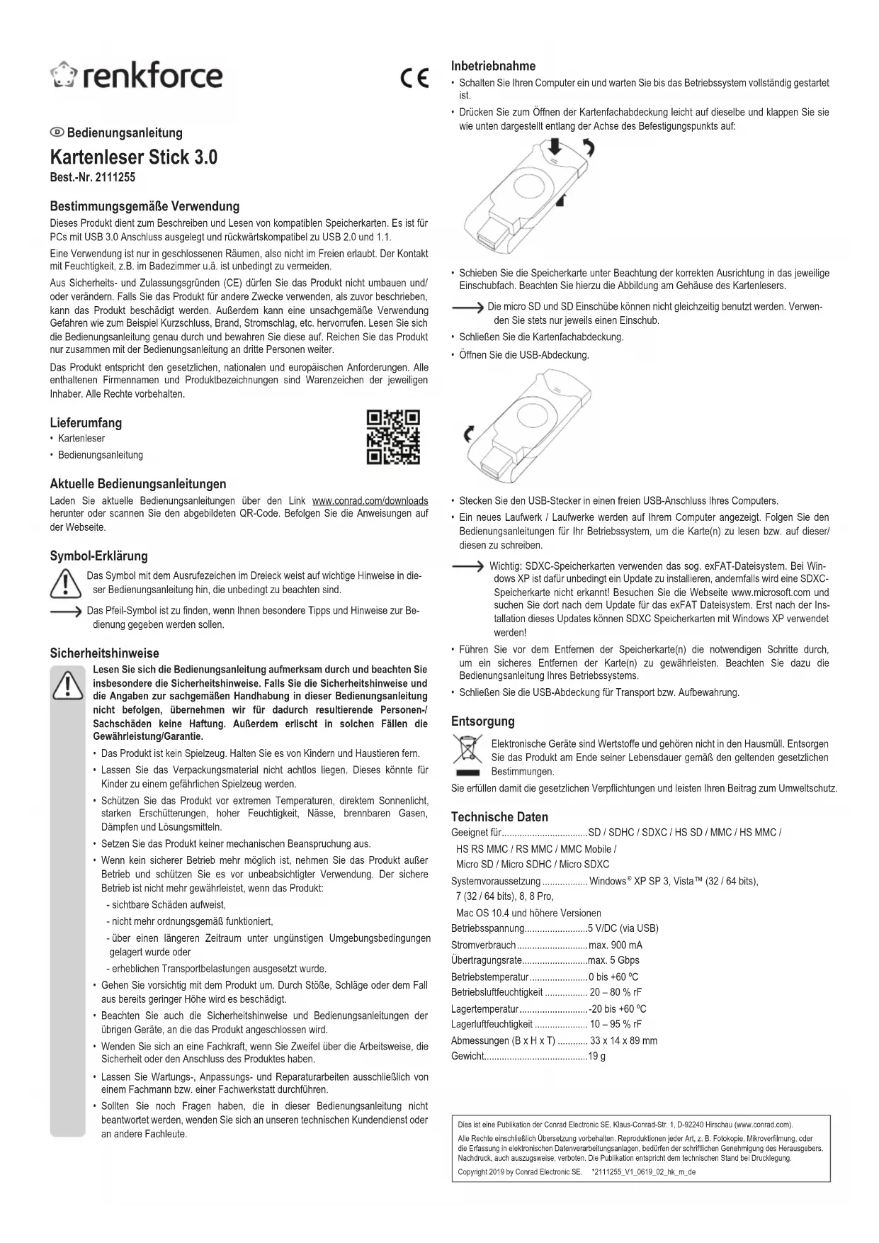 - x 14 x 89 mm Poids g Mode d'emploi Memory stick multi-cartes 3.0 Nº de commande 2111255 Utilisation prévue Le produit est conçu pour la lecture et l’écriture sur des cartes mémoire compatibles. Il a été conçu pour un ordinateur (PC) doté d’une connexion USB 3.0 et est rétro compatible avec USB 2.0 et 1.1. L’utilisation est uniquement autorisée en intérieur, dans les locaux fermés ; l’utilisation en plein air est interdite. Impérativement éviter tout contact avec l’humidité, par ex. dans la salle de bains, etc. Pour des raisons de sécurité et d’homologation (CE), toute transformation et/ou modication du produit est interdite. Si vous utilisez le produit à d’autres ns que celles décrites précédemment, cela risque d’endommager le produit. Par ailleurs, une utilisation incorrecte peut être source de dangers tels que court-circuit, incendie, électrocution. Lisez attentivement le mode d’emploi et conservez le. Ne transmettez le produit à des tiers qu’accompagné de son mode d’emploi. Le produit est conforme aux exigences des directives européennes et nationales en vigueur. Tous les noms d’entreprises et appellations de produits contenus dans ce mode d’emploi sont des marques déposées des propriétaires correspondants. Tous droits réservés. Contenu d’emballage p. 19