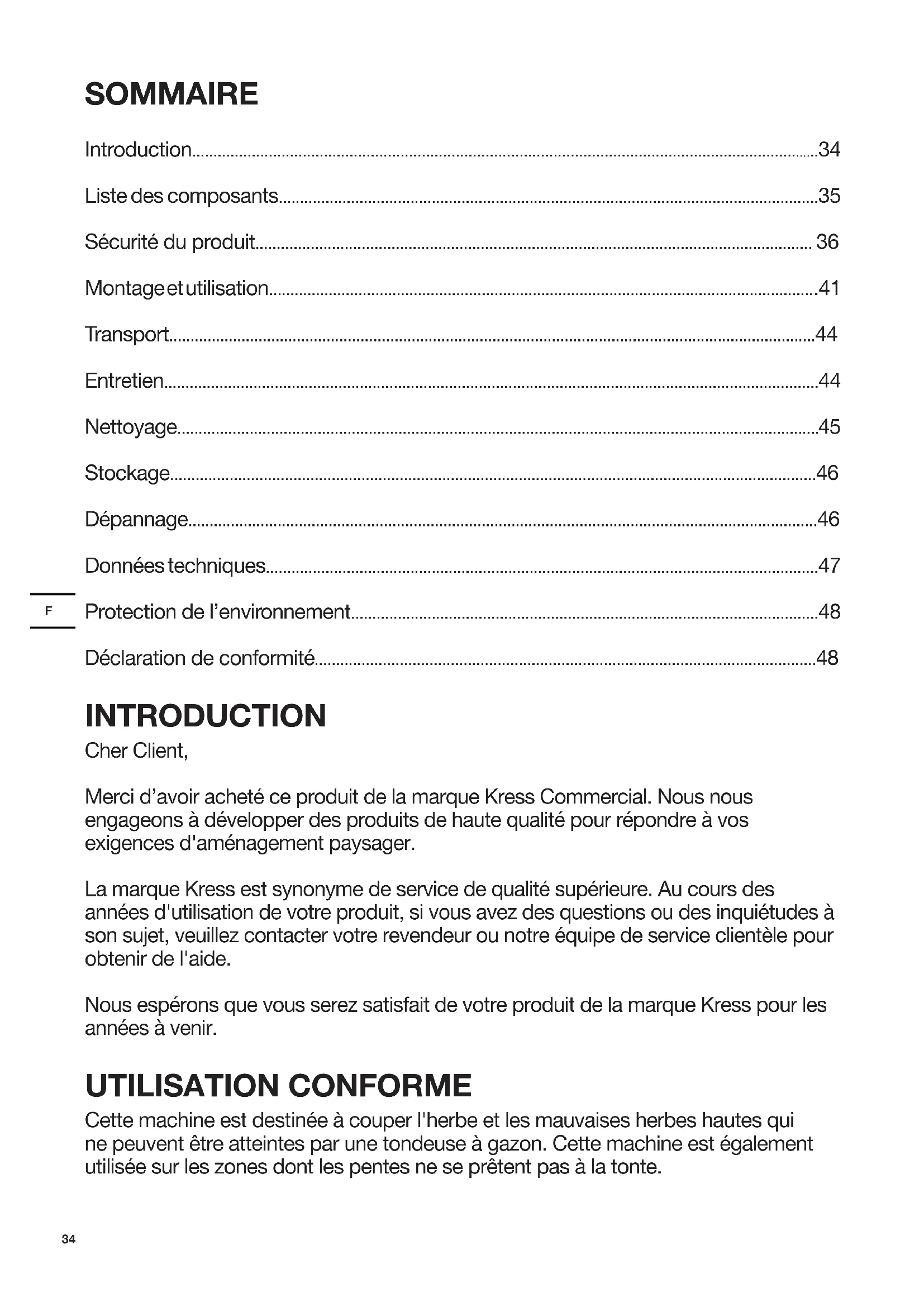 - Déclaration de conformité INTRODUCTION Cher Client, Merci d’avoir acheté ce produit de la marque Kress Commercial. Nous nous engageons à développer des produits de haute qualité pour répondre à vos exigences d'aménagement paysager. La marque Kress est synonyme de service de qualité supérieure. Au cours des années d'utilisation de votre produit, si vous avez des questions ou des inquiétudes à son sujet, veuillez contacter votre revendeur ou notre équipe de service clientèle pour obtenir de l'aide. Nous espérons que vous serez satisfait de votre produit de la marque Kress pour les années à venir. UTILISATION CONFORME Cette machine est destinée à couper l'herbe et les mauvaises herbes hautes qui ne peuvent être atteintes par une tondeuse à gazon. Cette machine est également utilisée sur les zones dont les pentes ne se prêtent pas à la tonte.F p. 48
