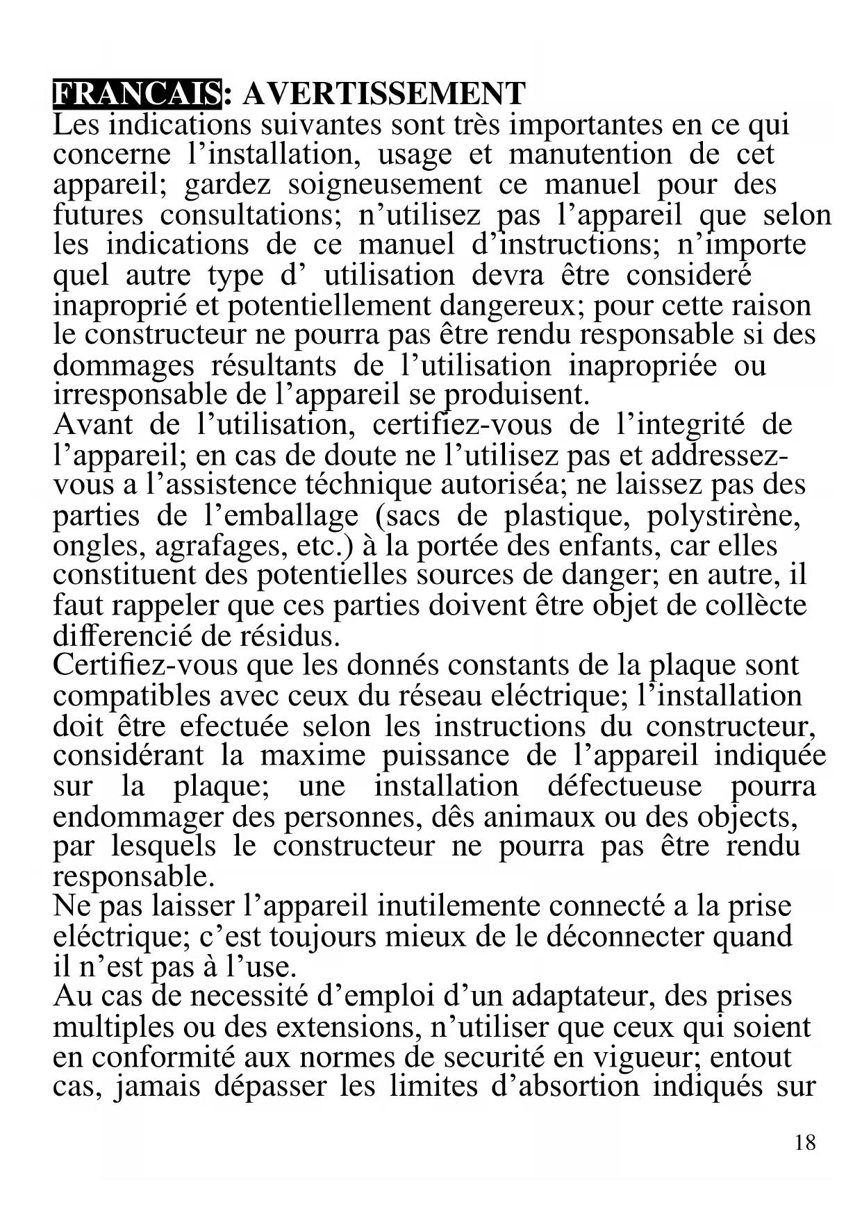 - Termostato regulável, Dispositivo de segurança RESÍDUOS DE APARELHIOS ELÉCTRICOS E ELÉCTRÓNICOS O aparelho é composto de algumas partes não biodegradáveis e de substâncias potencialmente tóxicas para o ambiente, se não forem correctamente eliminadas; outras partes podem ser recicladas. É dever de todos contribuir para a saúde ecológica do ambiente. Observando os correctos procedimentos de eliminação. O símbolo mostrado ao lado indica que o aparelho responde aos requisitos exigidos pelas novas directivas introduzidas pela tutela do ambiente (2002/96/EC, 2003/108/EC, 2002/95/EC, 2012/19/EC) e que deve ser eliminado correctamente no final do seu período de vida. Peça informações na câmara municipal da sua área de residência, se precisar de saber a localização dos centros de recolha deste tipo de resíduos. Quem não eliminar o aparelho do modo indicado neste parágrafo responde segundo as leis em vigor.18 FRANCAIS: AVERTISSEMENT Les indications suivantes sont très importantes en ce qui concerne l’installation, usage et manutention de cet appareil; gardez soigneusement ce manuel pour des futures consultations; n’utilisez pas l’appareil que selon les indications de ce manuel d’instructions; n’importe quel autre type d’ utilisation devra être consideré inaproprié et potentiellement dangereux; pour cette raison le constructeur ne pourra pas être rendu responsable si des dommages résultants de l’utilisation inapropriée ou irresponsable de l’appareil se produisent. Avant de l’utilisation, certifiez-vous de l’integrité de l’appareil; en cas de doute ne l’utilisez pas et addressez- vous a l’assistence téchnique autoriséa; ne laissez pas des parties de l’emballage (sacs de plastique, polystirène, ongles, agrafages, etc.) à la portée des enfants, car elles constituent des potentielles sources de danger; en autre, il faut rappeler que ces parties doivent être objet de collècte differencié de résidus. Certifiez-vous que les donnés constants de la plaque sont compatibles avec ceux du réseau eléctrique; l’installation doit être efectuée selon les instructions du constructeur, considérant la maxime puissance de l’appareil indiquée sur la plaque; une installation défectueuse pourra endommager des personnes, dês animaux ou des objects, par lesquels le constructeur ne pourra pas être rendu responsable. Ne pas laisser l’appareil inutilemente connecté a la prise eléctrique; c’est toujours mieux de le déconnecter quand il n’est pas à l’use. Au cas de necessité d’emploi d’un adaptateur, des prises multiples ou des extensions, n’utiliser que ceux qui soient en conformité aux normes de securité en vigueur; entout cas, jamais dépasser les limites d’absortion indiqués sur19 l’adaptateur simple et/ou sur les extensions, ni ceux de maxime puissance indiqués sur les adaptateurs multiples. Débranchez toujours l'appareil de l'alimentation électrique s'il est laissé sans surveillance. Pour le nettoyage déconnectez la fiche. Quand l’appareil soit hors usage et ait été décidé qu’il ne sera pas reparé, on reccomande son inutilisation, en coupant son câble d’alimentation. - Ne pas approcher le câble d’alimentation d’objects coupants ou de surfaces chaudes, et ne pas tirer sur le cordon d’alimentation pour le débrancher de la prise. Ne le laissez pas pendre du plan de travail où un enfant pourrait le tenir. - Ne pas utiliser l’appareil si le câble d’alimentation ou la fiche de connéction eléctrique sont endommagés, ou encore en cas de court-circuits; dans ce cas là, apporter l’appareil a un centre d’assistence autorisé. - L’appareil n’est pas indiqué pour être exposé à des conditions météorologiques défavorables (pluie, vent, humidité, la glace, etc.); Gardez-le dans un endroit sec. Jamais opérer ou même toucher l’appareil avec les mains mouillées ou les pieds nus. - Ce produit ne doit pas être utilisé par les enfants, même s'ils ont plus de 8 ans. - Les enfants ne doivent pas jouer avec cet appareil. - Cet appareil peut être utilisé par des personnes ayant des capacités physiques, sensorielles ou mentales réduites, ou qui manquent d'expérience ou de connaissances, si elles ont été correctement supervisées ou ont reçu des instructions pour utiliser cet appareil en toute sécurité. - Gardez l’appareil et le câble d’alimentation hors la portée des enfants agés de moins de 8 ans. - N’utiliser que des accéssoires e pièces d’origine. Si le câble d'alimentation est endommagé ou en cas de20 panne et / ou de dysfonctionnement, ne modifiez pas l'appareil. Toute réparation doit être effectuée par le fabricant ou par son service d'assistance technique ou, en tout cas, par une personne possédant une qualification similaire, afin d'éviter tout risque. Le non-respect de ce qui précède peut compromettre la sécurité de l'appareil et invalider les conditions de la garantie. ATTENTION: Cet appareil comporte une fonction de chauffage. Quelques surfaces, même si non la plaque elle même, pourront atteindre des températures élevées. Étant donné que la sensibilité à la température diffère de personne à personne, cet appareil devrà être usé avec PRUDENCE. Placez l’appareil sur des surfaces adéhrentes et préparées pour cet effet, et utilisez les mésures de protection contre la chaleur conseillées. Cet appareil est destiné à être utilisé dans les ménages et des applications similaires: les cuisines du personnel dans les magasins, bureaux et autres environnements de travail, pour les clients dans les hôtels, motels et autres environnements de type résidentiel, de type lit et petit- déjeuner, hébergement. Avant chaque utilisation, effectuez le cordon d'alimentation. Ne soumettez pas le produit à des chocs susceptibles de l'endommager. L’appareil n’est pas conçu pour être utilisé avec une minuterie extérieure o