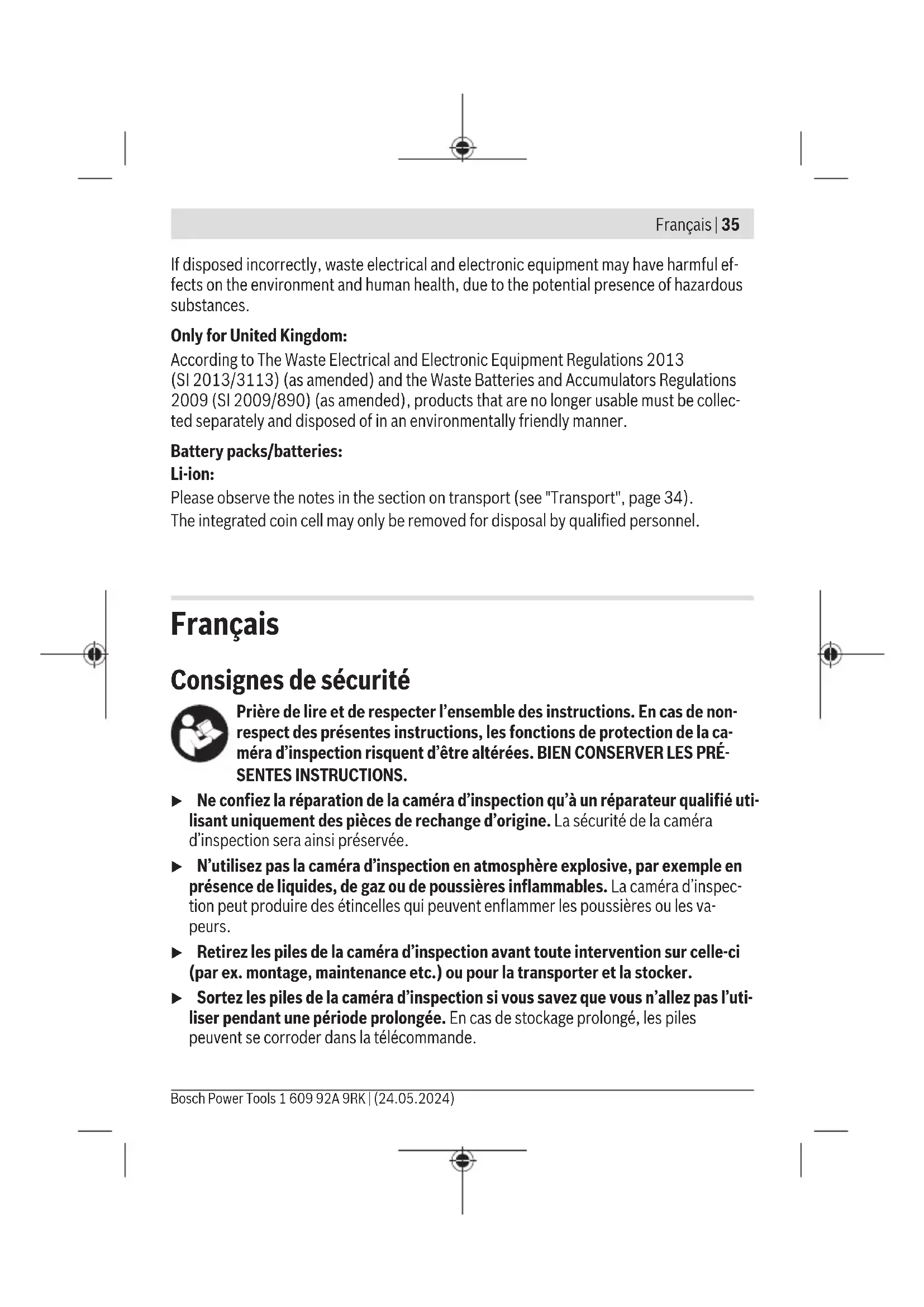 - <Switch off after …>: Choose the time interval after which the inspection camera will switch off automatically if no button is pressed. – <Device info>: Here you will find device information, such as the installed software version and legal information. – <Factory reset>: You can reset all of the menu options to factory settings. This also simultaneously, permanently delete all of the saved files. Saving/Transferring the Recordings Taking a Photo Press the photo recording button(12) to take a photo of the current display view. The photos are stored in the internal memory of the inspection camera and can be trans- ferred via USBType-C®. Data transfer via the USB Type-C® interface Switch on the inspection camera to transfer data via the USB Type-C® interface. Open the flap for the USB Type-C® port(17). Connect the USB Type-C® port to your PC via the USB Type-C® cable(18). Bosch Power Tools 1 609 92A 9RK | (24.05.2024)32 | English Open the file browser on your PC and select theBosch_GIC drive. The saved files can be copied from the internal memory of the inspection camera, moved to your PC or deleted. As soon as you have completed the required operation, disconnect the drive following the standard procedure. Note: Always disconnect the drive from the operating system of the PC first (eject drive), as failure to do so may damage the internal memory of the inspection camera. Remove the USB Type-C® cable (the inspection camera will switch off automatically). Close the upper flap(16) to protect against dust or splashes. Note: Only use the USB Type-C® interface to connect the inspection camera to a PC. The inspection camera may be damaged if connected to other devices. Note: The USB Type-C® interface can only be used for data transfer. Rechargeable bat- teries or other devices cannot be charged by this interface. Working Advice Check the environment that you want to inspect, paying particular attention to obstacles or hazardous areas. Bend the camera cable(1) so that the camera head can be easily introduced into the en- vironment to be inspected. Carefully introduce the camera cable. Adjust the brightness of the camera illumination light(3) so that the image is easily re- cognisable. When photographing highly reflective objects, for example, you can achieve better results in lower light or using black and white contrast setting. If objects to be inspected look blurred, then reduce or increase the distance between camera head(2) and object. Errors – causes and corrective measures Error indicator in the display Cause Corrective measures (yellow warning) Internal memory al- most full Delete the files from the internal memory. (red warning) Internal memory full Delete the files from the internal memory. Error in the internal memory Restart the inspection camera. If the problem persists, contact an authorised Bosch after-sales service centre. 1 609 92A 9RK | (24.05.2024) Bosch Power ToolsEnglish | 33 Maintenance and Service Maintenance and Cleaning Do not immerse the handheld device(13) in water or other liquids. Always keep the inspection camera clean. Clean the inspection camera and all accessor- ies particularly thoroughly after you have worked in areas with substances harmful to health. Wipe off any dirt using a damp, soft cloth. Do not use any detergents or solvents. Clean the camera lens(4) in particular regularly and make sure to check for any lint. Replacing the Built-in Coin Cell The coin cell replacement must be performed by Bosch or by an after-sales service centre authorised to work with Bosch power tools. u Caution: The coin cell must always be replaced with a coin cell of the same type. There is a risk of explosion. u Remove and dispose of drained coin cell correctly. Drained coin cell may leak and damage the product or cause personal injury. After-Sales Service and Application Service Our after-sales service responds to your questions concerning maintenance and repair of your product as well as spare parts. You can find explosion drawings and information on spare parts at: www.bosch-pt.com The Bosch product use advice team will be happy to help you with any questions about our products and their accessories. In all correspondence and spare parts orders, please always include the 10‑digit article number given on the nameplate of the product. Malaysia Robert Bosch Sdn. Bhd.(220975-V) PT/SMY No. 8A, Jalan 13/6 46200 Petaling Jaya Selangor Tel.: (03) 79663194 Toll-Free: 1800 880188 Fax: (03) 79583838 E-Mail: kiathoe.chong@my.bosch.com www.bosch-pt.com.my Bosch Power Tools 1 609 92A 9RK | (24.05.2024)34 | English Great Britain Robert Bosch Ltd. (B.S.C.) P.O. Box 98 Broadwater Park North Orbital Road Denham Uxbridge UB 9 5HJ At www.bosch-pt.co.uk you can order spare parts or arrange the collection of a product in need of servicing or repair. Tel. Service: (0344) 7360109 E-Mail: boschservicecentre@bosch.com You can find further service addresses at: www.bosch-pt.com/serviceaddresses Transport The recommended lithium-ion batteries are subject to legislation on the transport of dan- gerous goods. The user can transport the batteries by road without further require- ments. When the batteries are shipped by third parties (e.g. air transport or forwarding agency), special requirements on packaging and labelling (e.g. ADR regulations) must be met. A dangerous goods expert must be consulted when preparing the items for shipping. Dispatch battery packs only when the housing is undamaged. Tape or mask off open con- tacts and pack up the battery in such a manner that it cannot move around in the pack- aging. Please also observe the possibility of more detailed national regulations. Disposal The inspection camera, batteries/rechargeable batteries, accessories and packaging should be sorted for environmentally friendly recycling. Do not dispose of the inspection camera or batteries/rechargeable bat- teries with household waste. Only for EU countries: In accordance with Directive 2012
