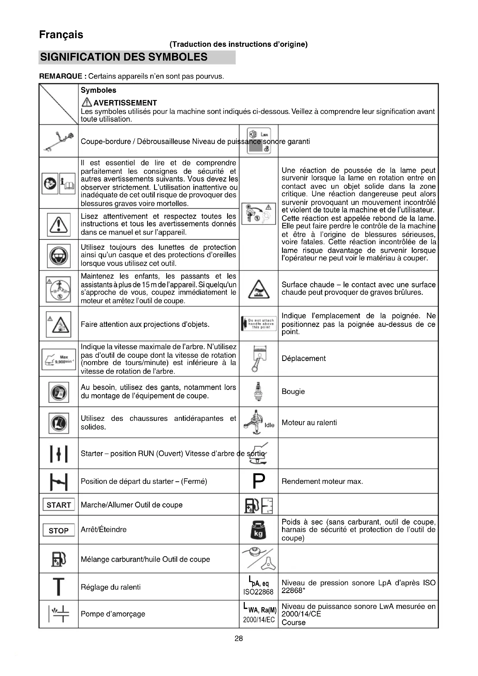 REMARQUE : Certains appareils n’en sont pas pourvus. Symboles AVERTISSEMENT Les symboles utilisés pour la machine sont indiqués ci-dessous. Veillez à comprendre leur signifi cation avant toute utilisation. Coupe-bordure / Débrousailleuse Niveau de puissance sonore garanti Il est essentiel de lire et de comprendre parfaitement les consignes de sécurité et autres avertissements suivants. Vous devez les observer strictement. L’utilisation inattentive ou inadéquate de cet outil risque de provoquer des blessures graves voire mortelles. Une réaction de poussée de la lame peut survenir lorsque la lame en rotation entre en contact avec un objet solide dans la zone critique. Une réaction dangereuse peut alors survenir provoquant un mouvement incontrôlé et violent de toute la machine et de l’utilisateur. Cette réaction est appelée rebond de la lame. Elle peut faire perdre le contrôle de la machine et être à l’origine de blessures sérieuses, voire fatales. Cette réaction incontrôlée de la lame risque davantage de survenir lorsque l’opérateur ne peut voir le matériau à couper. Lisez attentivement et respectez toutes les instructions et tous les avertissements donnés dans ce manuel et sur l’appareil. Utilisez toujours des lunettes de protection ainsi qu’un casque et des protections d’oreilles lorsque vous utilisez cet outil. Maintenez les enfants, les passants et les assistants à plus de 15 m de l’appareil. Si quelqu'un s’approche de vous, coupez immédiatement le moteur et arrêtez l’outil de coupe. Surface chaude – le contact avec une surface chaude peut provoquer de graves brûlures. Faire attention aux projections d’objets. Indique l’emplacement de la poignée. Ne positionnez pas la poignée au-dessus de ce point. min