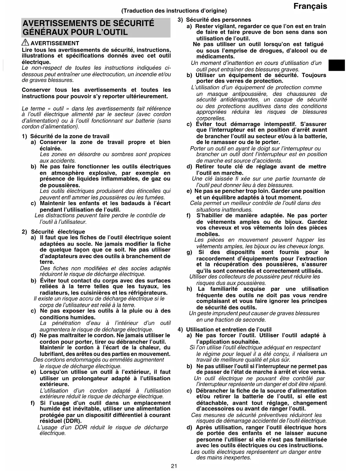 AVERTISSEMENT Lire tous les avertissements de sécurité, instructions, illustrations et spécifi cations donnés avec cet outil électrique. Le non-respect de toutes les instructions indiquées ci- dessous peut entraîner une électrocution, un incendie et/ou de graves blessures. Conserver tous les avertissements et toutes les instructions pour pouvoir s’y reporter ultérieurement. Le terme « outil » dans les avertissements fait référence à l’outil électrique alimenté par le secteur (avec cordon d’alimentation) ou à l’outil fonctionnant sur batterie (sans cordon d’alimentation).