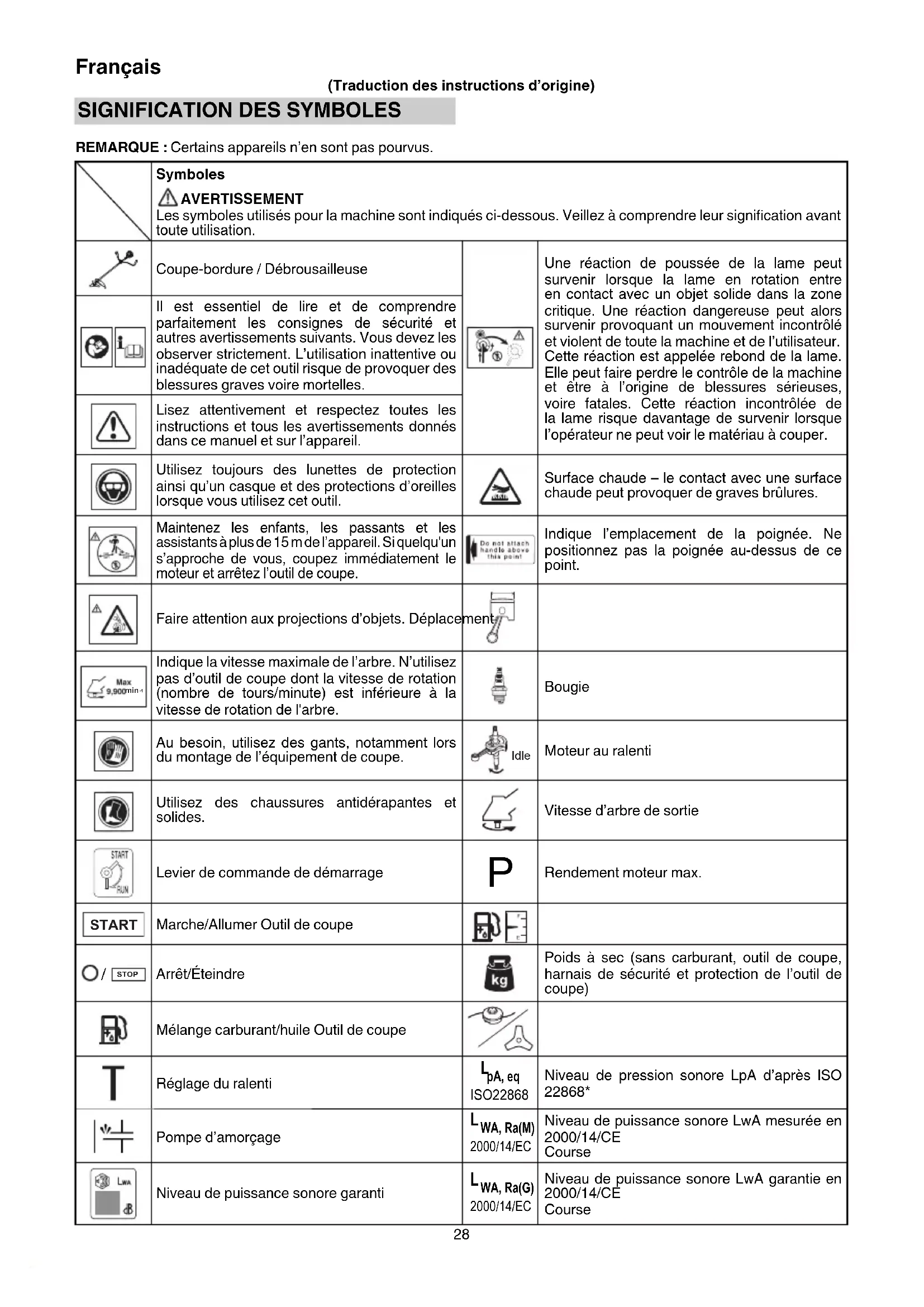 REMARQUE : Certains appareils n’en sont pas pourvus. Symboles AVERTISSEMENT Les symboles utilisés pour la machine sont indiqués ci-dessous. Veillez à comprendre leur signifi cation avant toute utilisation. Coupe-bordure / Débrousailleuse Une réaction de poussée de la lame peut survenir lorsque la lame en rotation entre en contact avec un objet solide dans la zone critique. Une réaction dangereuse peut alors survenir provoquant un mouvement incontrôlé et violent de toute la machine et de l’utilisateur. Cette réaction est appelée rebond de la lame. Elle peut faire perdre le contrôle de la machine et être à l’origine de blessures sérieuses, voire fatales. Cette réaction incontrôlée de la lame risque davantage de survenir lorsque l’opérateur ne peut voir le matériau à couper. Il est essentiel de lire et de comprendre parfaitement les consignes de sécurité et autres avertissements suivants. Vous devez les observer strictement. L’utilisation inattentive ou inadéquate de cet outil risque de provoquer des blessures graves voire mortelles. Lisez attentivement et respectez toutes les instructions et tous les avertissements donnés dans ce manuel et sur l’appareil. Utilisez toujours des lunettes de protection ainsi qu’un casque et des protections d’oreilles lorsque vous utilisez cet outil. Surface chaude – le contact avec une surface chaude peut provoquer de graves brûlures. Maintenez les enfants, les passants et les assistants à plus de 15 m de l’appareil. Si quelqu'un s’approche de vous, coupez immédiatement le moteur et arrêtez l’outil de coupe. Indique l’emplacement de la poignée. Ne positionnez pas la poignée au-dessus de ce point. Faire attention aux projections d’objets. Déplacement min