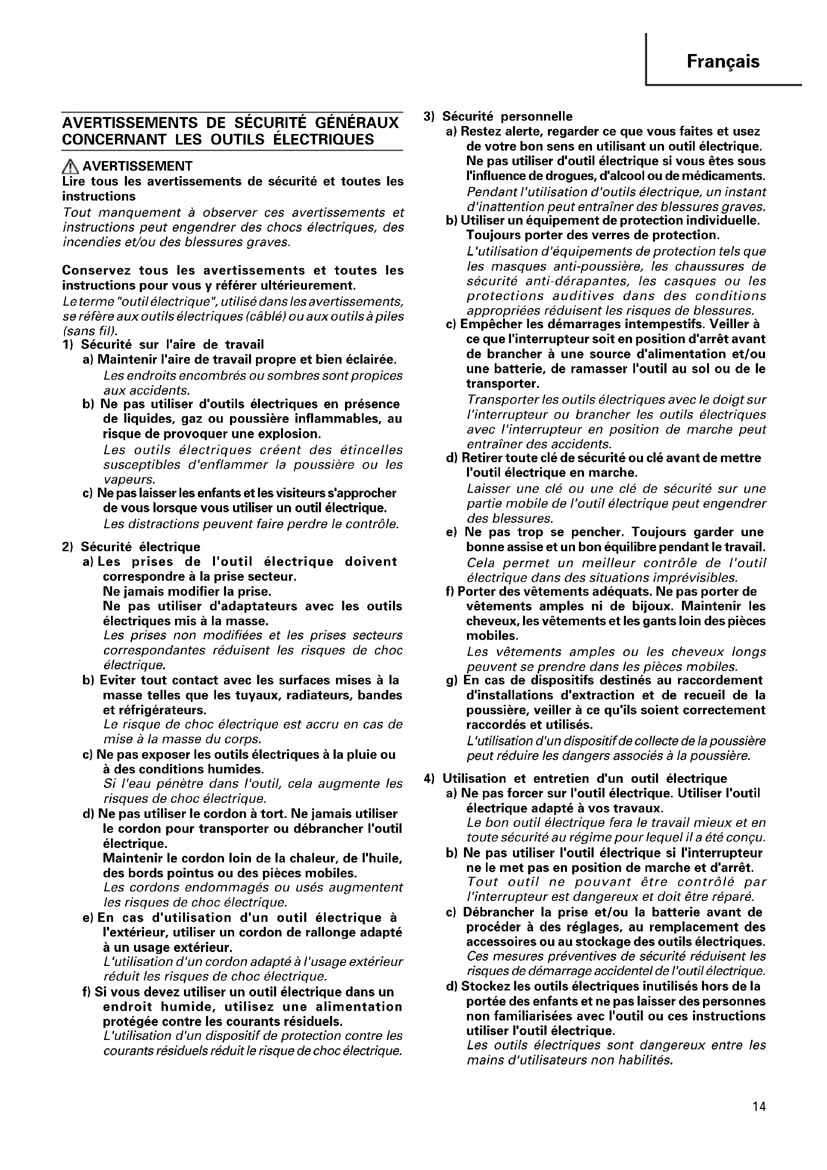 a) Ne pas forcer sur l'outil électrique. Utiliser l'outil électrique adapté à vos travaux. Le bon outil électrique fera le travail mieux et en toute sécurité au régime pour lequel il a été conçu. b) Ne pas utiliser l'outil électrique si l'interrupteur ne le met pas en position de marche et d'arrêt. Tout outil ne pouvant être contrôlé par l'interrupteur est dangereux et doit être réparé. c) Débrancher la prise et/ou la batterie avant de procéder à des réglages, au remplacement des accessoires ou au stockage des outils électriques. Ces mesures préventives de sécurité réduisent les risques de démarrage accidentel de l'outil électrique. d) Stockez les outils électriques inutilisés hors de la portée des enfants et ne pas laisser des personnes non familiarisées avec l'outil ou ces instructions utiliser l'outil électrique. Les outils électriques sont dangereux entre les mains d'utilisateurs non habilités. 03Fre_RB14DSL_WE 08/3/27, 19:261415 Français