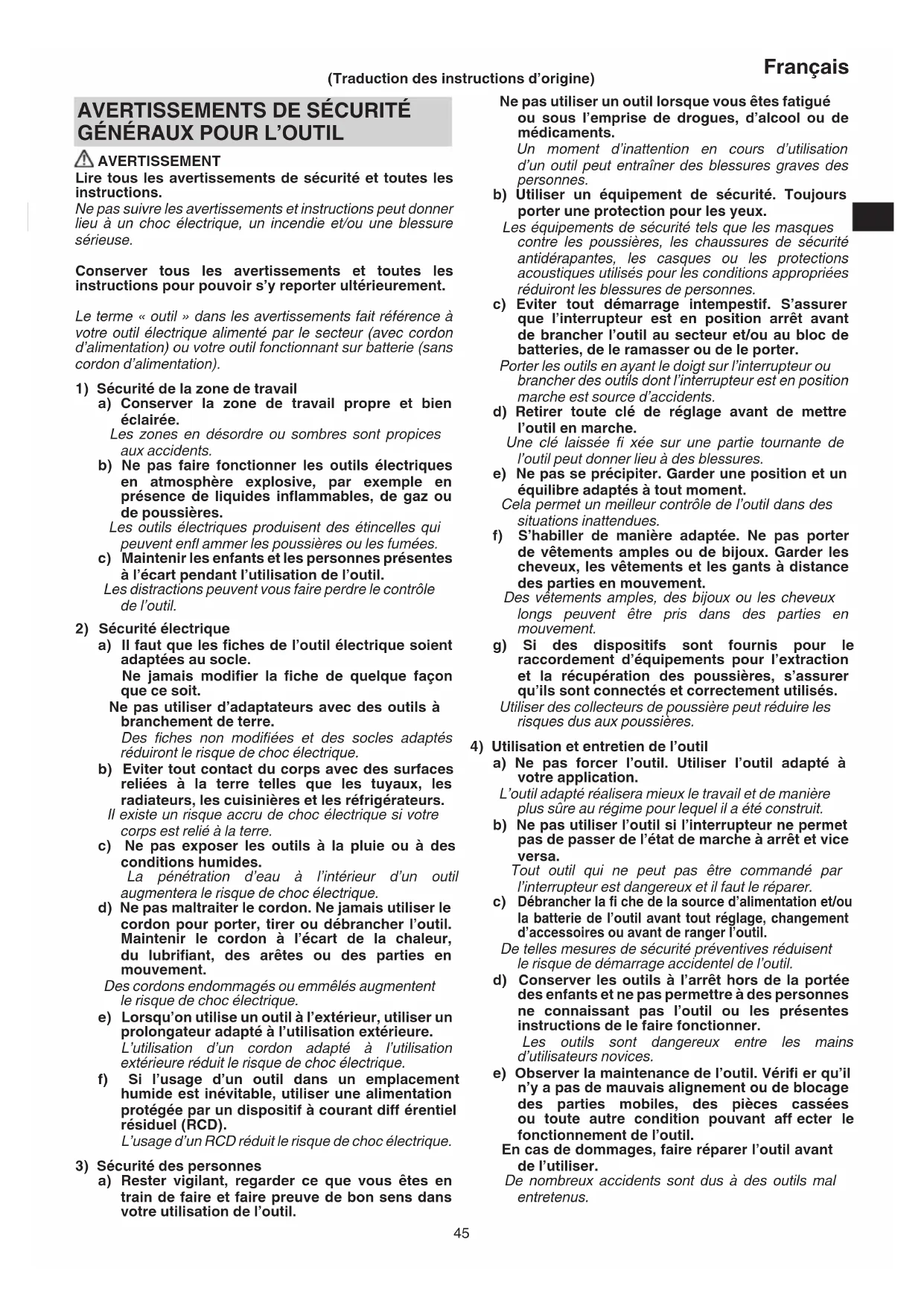 AVERTISSEMENT Lire tous les avertissements de sécurité et toutes les instructions. Ne pas suivre les avertissements et instructions peut donner lieu à un choc électrique, un incendie et/ou une blessure sérieuse. Conserver tous les avertissements et toutes les instructions pour pouvoir s’y reporter ultérieurement. Le terme « outil » dans les avertissements fait référence à votre outil électrique alimenté par le secteur (avec cordon d’alimentation) ou votre outil fonctionnant sur batterie (sans cordon d’alimentation).