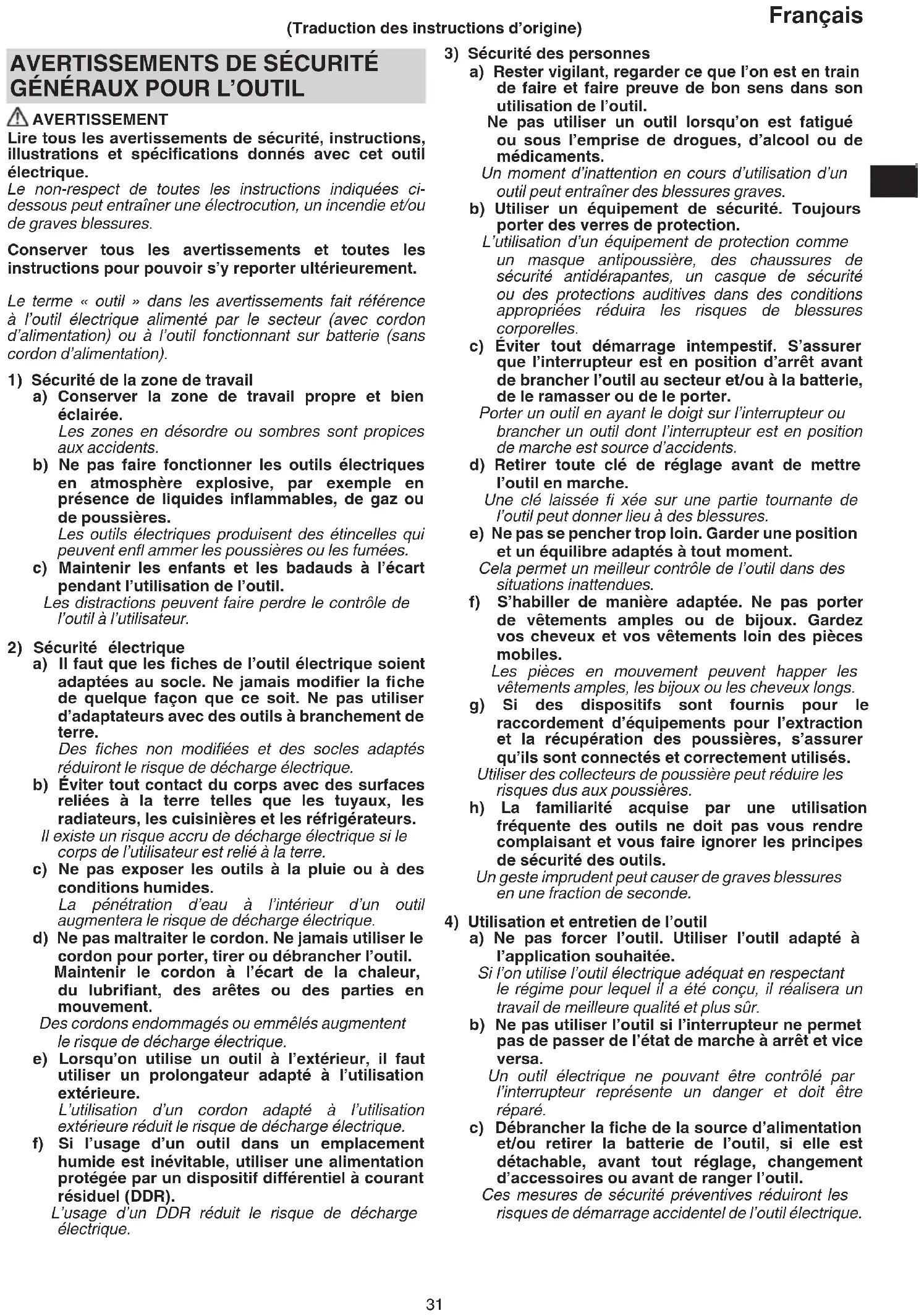a) Rester vigilant, regarder ce que l’on est en train de faire et faire preuve de bon sens dans son utilisation de l’outil. Ne pas utiliser un outil lorsqu’on est fatigué ou sous l’emprise de drogues, d’alcool ou de médicaments. Un moment d’inattention en cours d’utilisation d’un outil peut entraîner des blessures graves. b) Utiliser un équipement de sécurité. Toujours porter des verres de protection. L’utilisation d’un équipement de protection comme un masque antipoussière, des chaussures de sécurité antidérapantes, un casque de sécurité ou des protections auditives dans des conditions appropriées réduira les risques de blessures corporelles. c) Éviter tout démarrage intempestif. S’assurer que l’interrupteur est en position d’arrêt avant de brancher l’outil au secteur et/ou à la batterie, de le ramasser ou de le porter. Porter un outil en ayant le doigt sur l’interrupteur ou brancher un outil dont l’interrupteur est en position de marche est source d’accidents. d) Retirer toute clé de réglage avant de mettre l’outil en marche. Une clé laissée fi xée sur une partie tournante de l’outil peut donner lieu à des blessures. e) Ne pas se pencher trop loin. Garder une position et un équilibre adaptés à tout moment. Cela permet un meilleur contrôle de l’outil dans des situations inattendues. f) S’habiller de manière adaptée. Ne pas porter de vêtements amples ou de bijoux. Gardez vos cheveux et vos vêtements loin des pièces mobiles. Les pièces en mouvement peuvent happer les vêtements amples, les bijoux ou les cheveux longs. g) Si des dispositifs sont fournis pour le raccordement d’équipements pour l’extraction et la récupération des poussières, s’assurer qu’ils sont connectés et correctement utilisés. Utiliser des collecteurs de poussière peut réduire les risques dus aux poussières. h) La familiarité acquise par une utilisation fréquente des outils ne doit pas vous rendre complaisant et vous faire ignorer les principes de sécurité des outils. Un geste imprudent peut causer de graves blessures en une fraction de seconde.