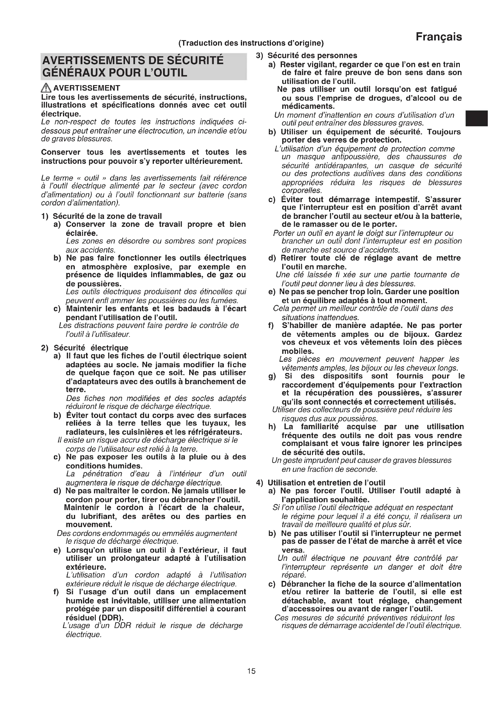 a) Rester vigilant, regarder ce que l’on est en train de faire et faire preuve de bon sens dans son utilisation de l’outil. Ne pas utiliser un outil lorsqu’on est fatigué ou sous l’emprise de drogues, d’alcool ou de médicaments. Un moment d’inattention en cours d’utilisation d’un outil peut entraîner des blessures graves. b) Utiliser un équipement de sécurité. Toujours porter des verres de protection. L’utilisation d’un équipement de protection comme un masque antipoussière, des chaussures de sécurité antidérapantes, un casque de sécurité ou des protections auditives dans des conditions appropriées réduira les risques de blessures corporelles. c) Éviter tout démarrage intempestif. S’assurer que l’interrupteur est en position d’arrêt avant de brancher l’outil au secteur et/ou à la batterie, de le ramasser ou de le porter. Porter un outil en ayant le doigt sur l’interrupteur ou brancher un outil dont l’interrupteur est en position de marche est source d’accidents. d) Retirer toute clé de réglage avant de mettre l’outil en marche. Une clé laissée fi xée sur une partie tournante de l’outil peut donner lieu à des blessures. e) Ne pas se pencher trop loin. Garder une position et un équilibre adaptés à tout moment. Cela permet un meilleur contrôle de l’outil dans des situations inattendues. f) S’habiller de manière adaptée. Ne pas porter de vêtements amples ou de bijoux. Gardez vos cheveux et vos vêtements loin des pièces mobiles. Les pièces en mouvement peuvent happer les vêtements amples, les bijoux ou les cheveux longs. g) Si des dispositifs sont fournis pour le raccordement d’équipements pour l’extraction et la récupération des poussières, s’assurer qu’ils sont connectés et correctement utilisés. Utiliser des collecteurs de poussière peut réduire les risques dus aux poussières. h) La familiarité acquise par une utilisation fréquente des outils ne doit pas vous rendre complaisant et vous faire ignorer les principes de sécurité des outils. Un geste imprudent peut causer de graves blessures en une fraction de seconde.