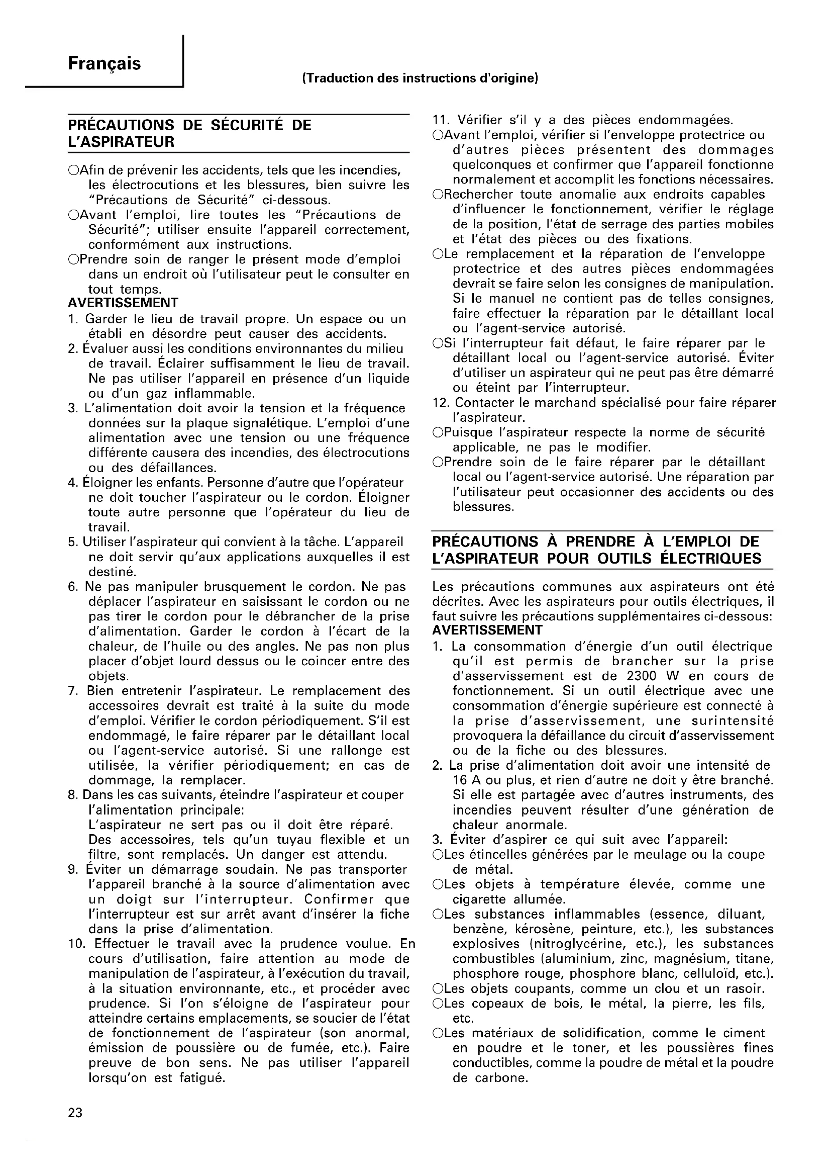 Les précautions communes aux aspirateurs ont été décrites. Avec les aspirateurs pour outils électriques, il faut suivre les précautions supplémentaires ci-dessous: AVERTISSEMENT