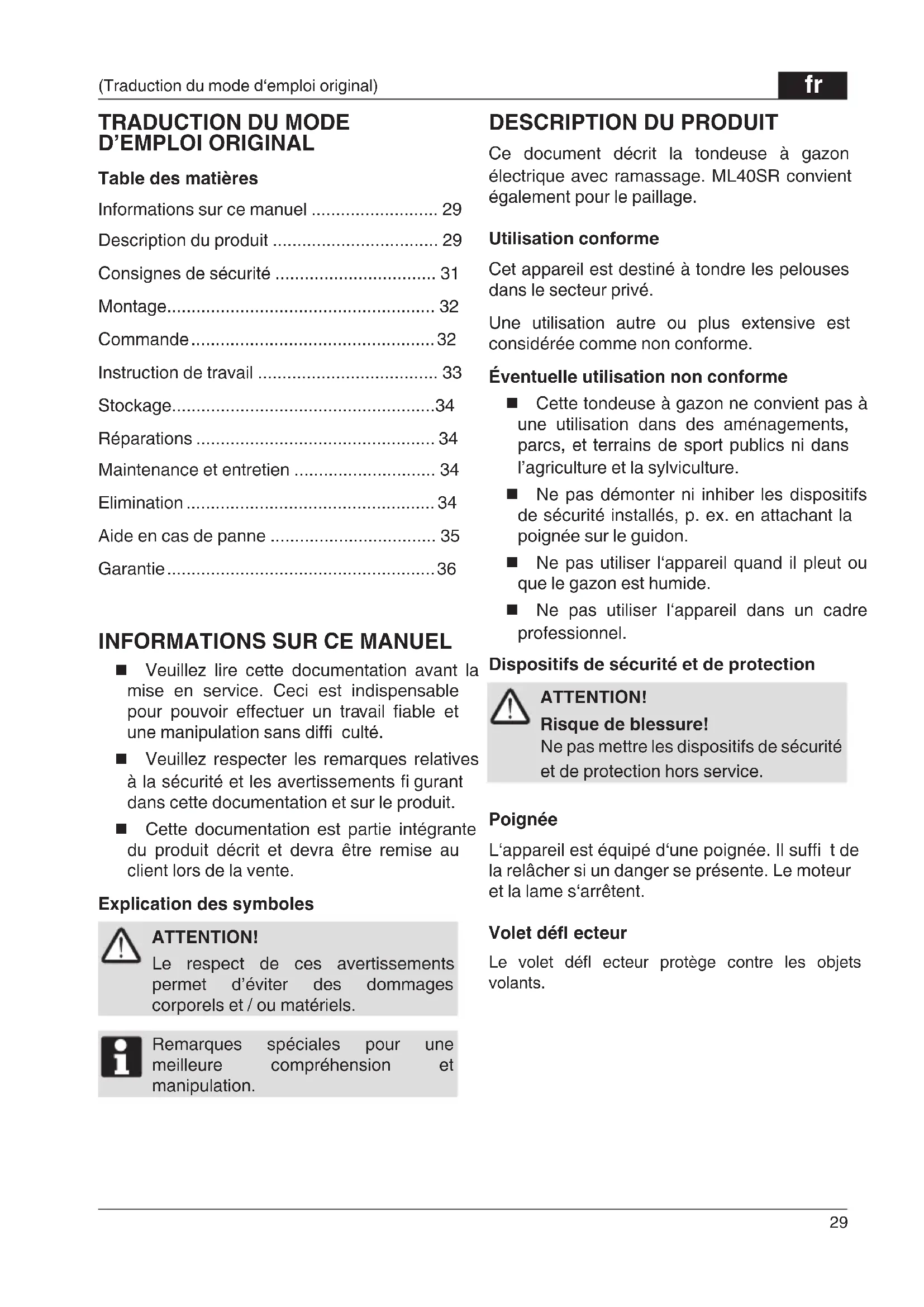 Ce document décrit la tondeuse à gazon électrique avec ramassage. ML40SR convient également pour le paillage. Utilisation conforme Cet appareil est destiné à tondre les pelouses dans le secteur privé. Une utilisation autre ou plus extensive est considérée comme non conforme. Éventuelle utilisation non conforme Cette tondeuse à gazon ne convient pas à une utilisation dans des aménagements, parcs, et terrains de sport publics ni dans l’agriculture et la sylviculture. Ne pas démonter ni inhiber les dispositifs de sécurité installés, p. ex. en attachant la poignée sur le guidon. Ne pas utiliser l‘appareil quand il pleut ou que le gazon est humide. Ne pas utiliser l‘appareil dans un cadre professionnel. Dispositifs de sécurité et de protection ATTENTION! Risque de blessure! Ne pas mettre les dispositifs de sécurité et de protection hors service. Poignée L‘appareil est équipé d‘une poignée. Il suffi t de la relâcher si un danger se présente. Le moteur et la lame s‘arrêtent. Volet défl ecteur Le volet défl ecteur protège contre les objets volants. 0000BookML34SR.indb290000BookML34SR.indb29 2017/12/0814:20:242017/12/0814:20:24fr ML 34SR / ML 40SR