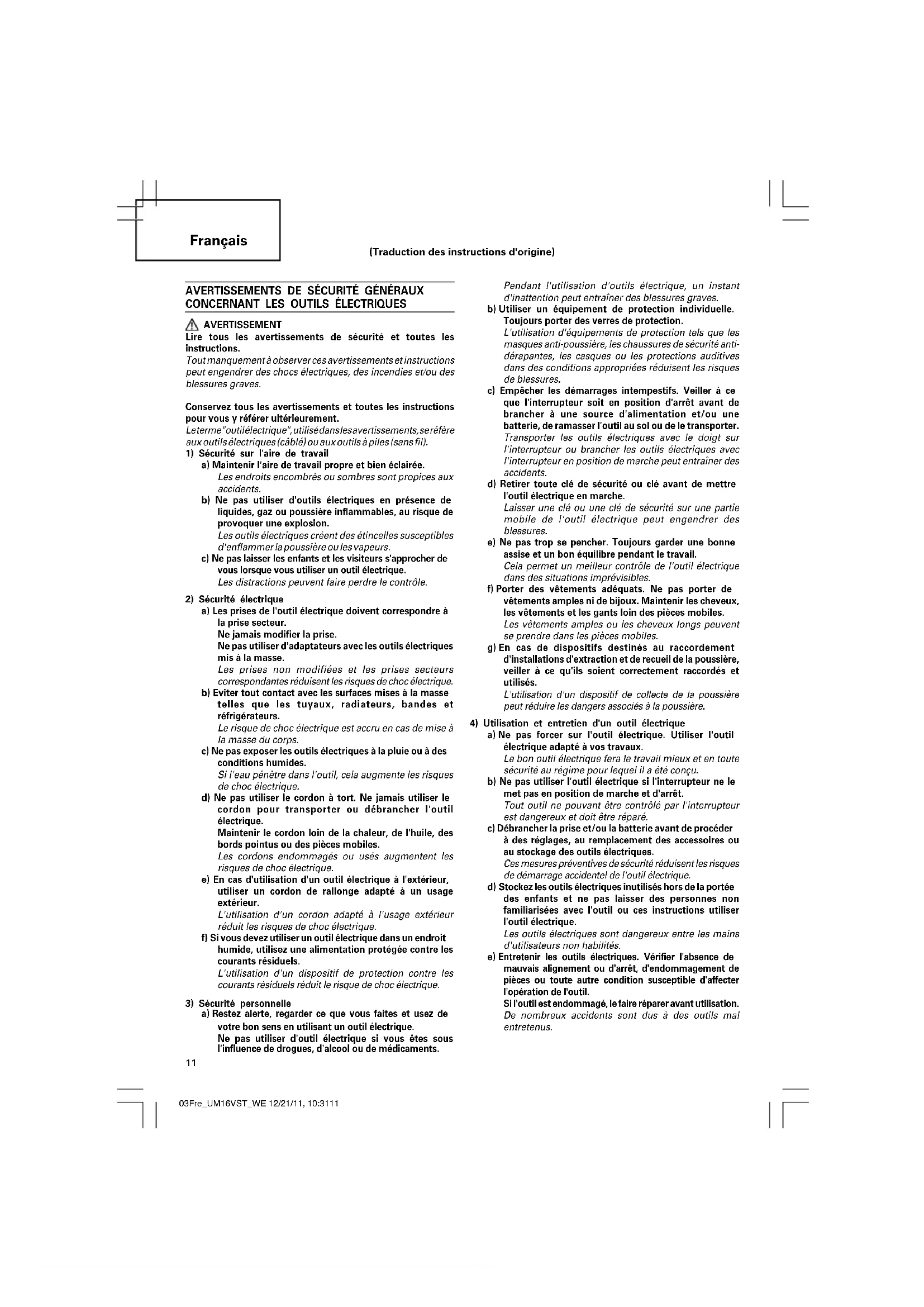 La valeur totale des vibrations a été mesurée par une méthode d’essai standard et peut être utilisée pour comparer un outil à un autre. Elle peut également être utilisée pour une évaluation préliminaire du niveau d’exposition. AVERTISSEMENT 䡬 La valeur d’émission de vibration en fonctionnement de l’outil électrique peut être différente de la valeur totale déclarée, en fonction des utilisations de l’outil. 䡬 Identification les mesures de protection de l’utilisateur fondées sur une estimation de l’exposition en conditions d’uitilisation (tenant compte de tous les aspects du cycle d’utilisation, tels que les moments où l’outil est mis hors tension ou lorsqu’il tourne à vide en plus des temps de déclenchements). 03Fre_UM16VST_WE 12/21/11, 10:311314 Italiano