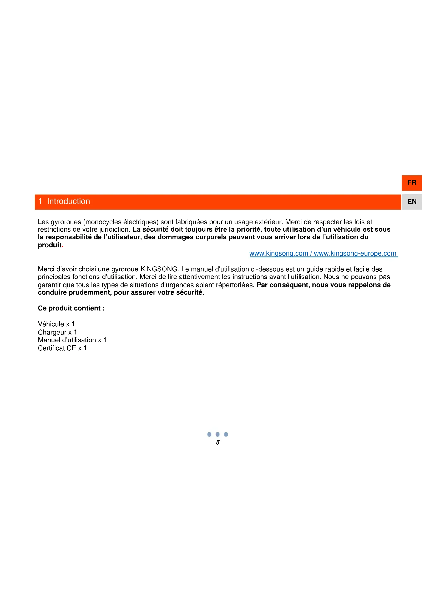 1 Introduction Les gyroroues (monocycles électriques) sont fabriquées pour un usage extérieur. Merci de respecter les lois et restrictions de votre juridiction. La sécurité doit toujours être la priorité, toute utilisation d’un véhicule est sous la responsabilité de l’utilisateur, des dommages corporels peuvent vous arriver lors de l’utilisation du produit. www.kingsong.com / www.kingsong-europe.com Merci d’avoir choisi une gyroroue KINGSONG. Le manuel d'utilisation ci-dessous est un guide rapide et facile des principales fonctions d’utilisation. Merci de lire attentivement les instructions avant l’utilisation. Nous ne pouvons pas garantir que tous les types de situations d'urgences soient répertoriées. Par conséquent, nous vous rappelons de conduire prudemment, pour assurer votre sécurité. Ce produit contient : Véhicule x 1 Chargeur x 1 Manuel d’utilisation x 1 Certificat CE x 16