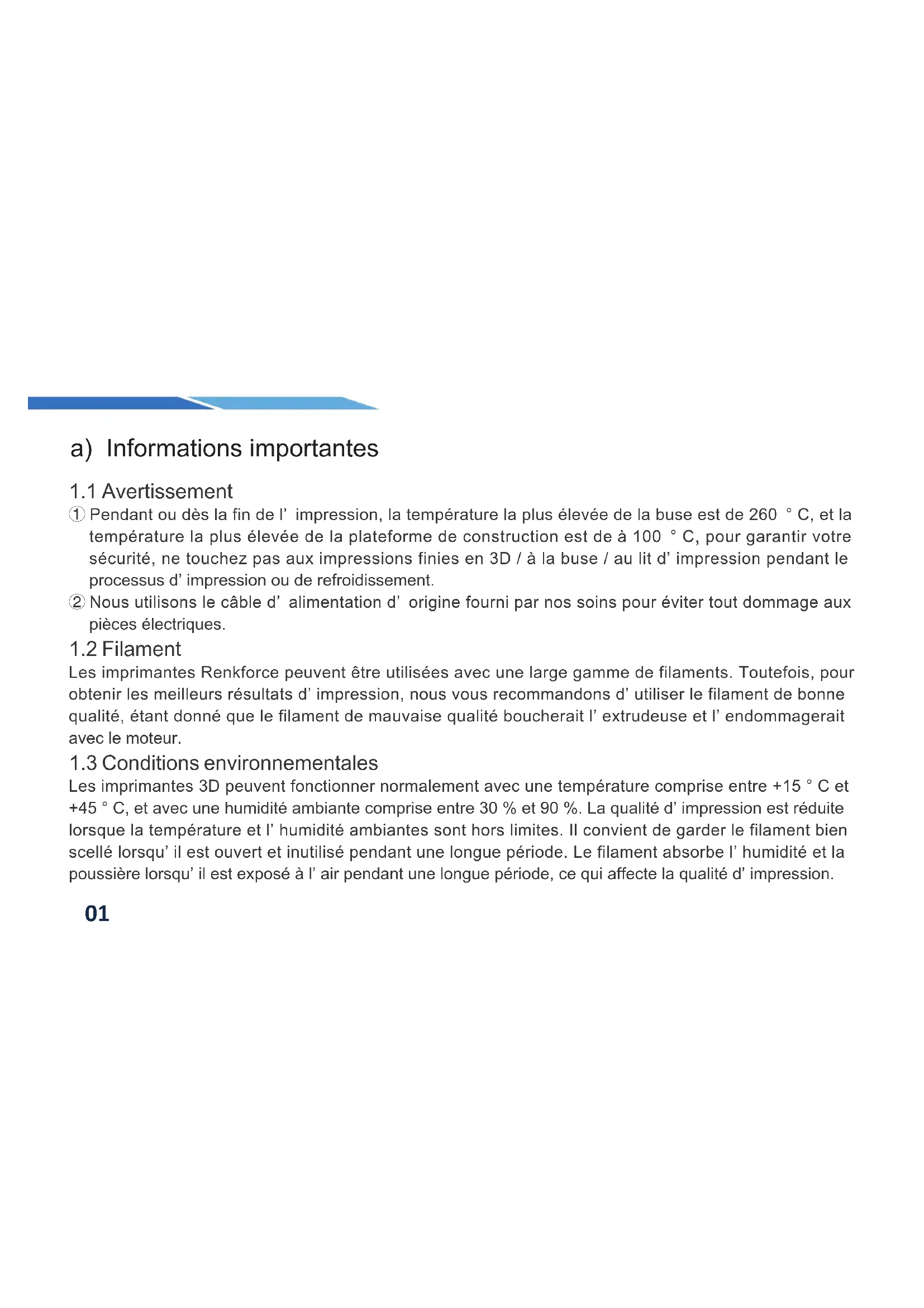 Les imprimantes Renkforce peuvent être utilisées avec une large gamme de filaments. Toutefois, pour obtenir les meilleurs résultats d’ impression, nous vous recommandons d’ utiliser le filament de bonne qualité, étant donné que le filament de mauvaise qualité boucherait l’ extrudeuse et l’ endommagerait avec le moteur.
