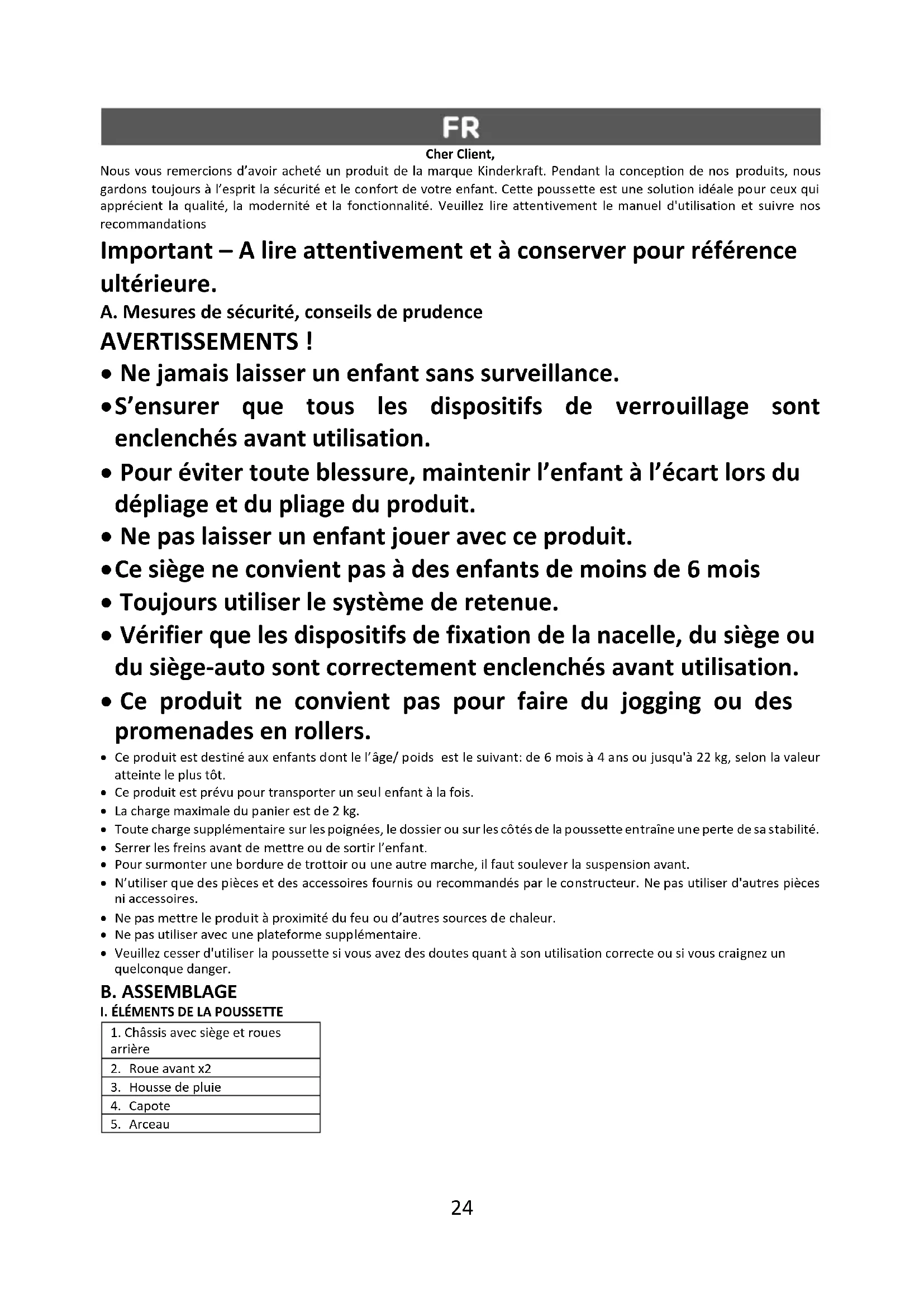 - Veuillez cesser d'utiliser la poussette si vous avez des doutes quant à son utilisation correcte ou si vous craignez un quelconque danger. B. ASSEMBLAGE