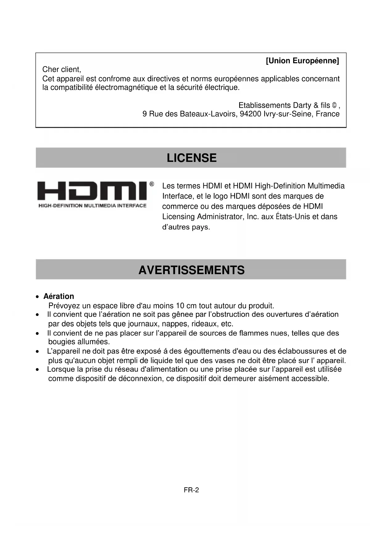 LICENSE AVERTISSEMENTS [Union Européenne] Cher client, Cet appareil est confrome aux directives et norms européennes applicables concernant la compatibilité électromagnétique et la sécurité électrique. Etablissements Darty & fils © , 9 Rue des Bateaux-Lavoirs, 94200 Ivry-sur-Seine, FranceFR-3