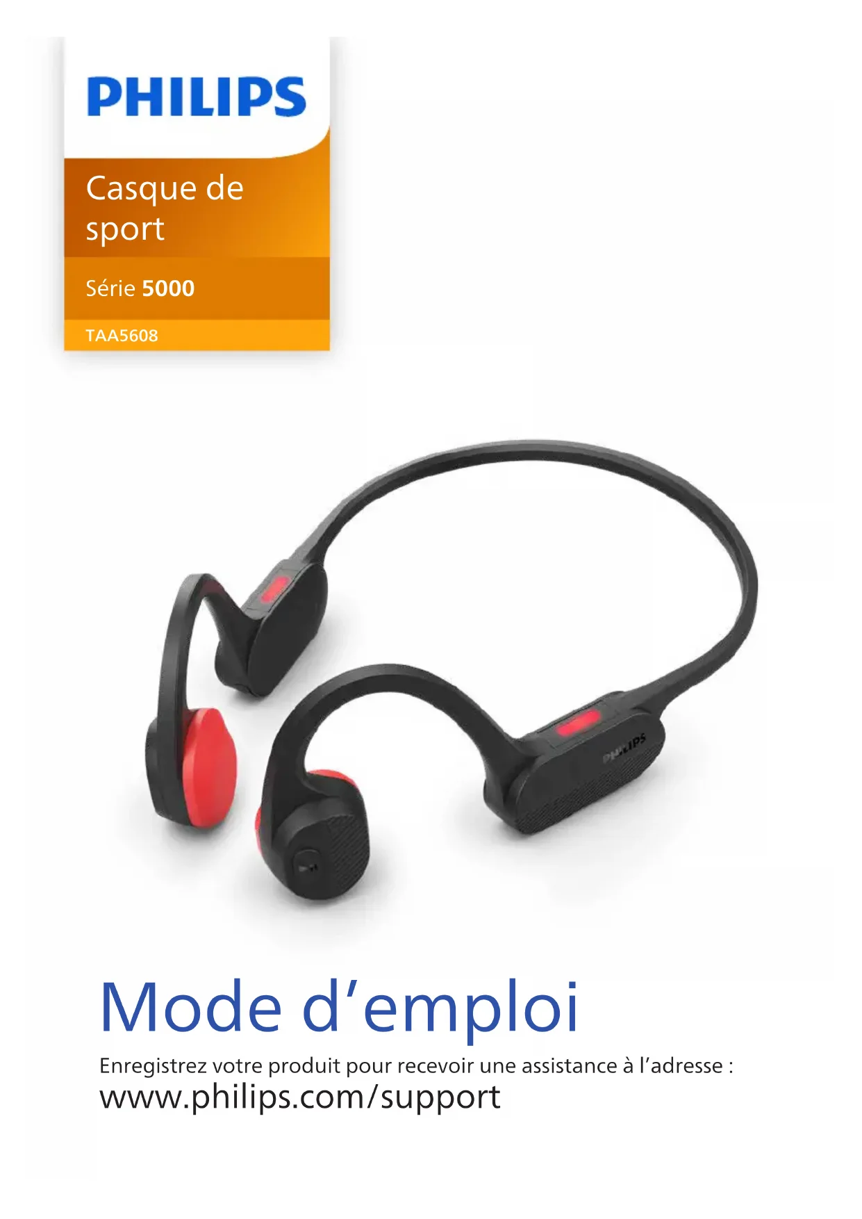 Mode d’emploi Enregistrez votre produit pour recevoir une assistance à l’adresse : www.philips.com/support Série5000 TAA5608 Casque de sport1 Instructions de sécurité importantes 2 Sécurité auditive 2 Informations générales 2 2 Votre casque Bluetooth 4 Contenu de la boîte 4 Autres appareils 4 Aperçu de votre casque Bluetooth sans fil 5 3 Mise en route 6 Téléchargement de l’application 6 Recharger la batterie 6 Appairage du casque avec votre téléphone portable 6 4 Utilisation de votre casque 8 Connexion du casque à votre appareil Bluetooth 8 Gestion de vos appels et de votre musique 9 5 Données techniques 11 6 Avis 12 Déclaration de conformité 12 Mise au rebut de votre ancien produit et de vos piles 12 Retrait de la batterie intégrée 12 Conformité aux CEM 13 Informations environnementales 13 Avis de conformité 13 7 Marques commerciales 15 8 Foire aux questions 16 Tables des matièresFR2 1 Instructions de sécurité importantes Sécurité auditive Danger