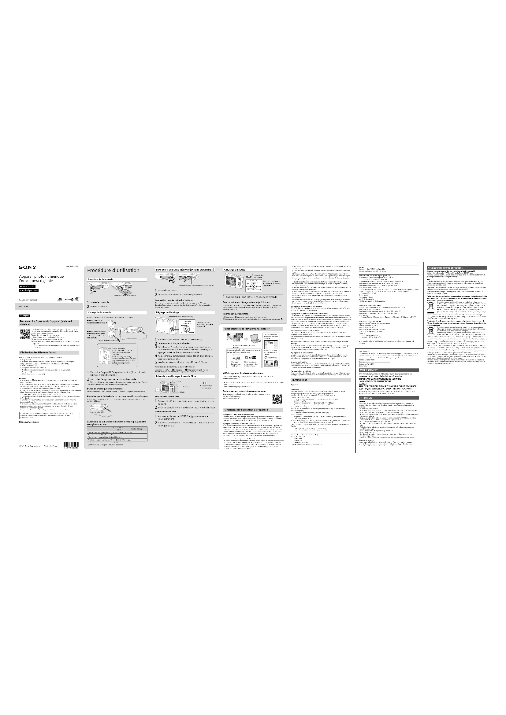 Si la forme de la fiche ne correspond pas à la prise secteur, utilisez un adaptateur de fiche accessoire de configuration correcte pour la prise secteur. ATTENTION Batterie Toute erreur de manipulation de la batterie peut provoquer son explosion, entraîner un incendie, voire même des brûlures de substances chimiques. Respectez les précautions suivantes: Ne démontez pas la batterie. N’écrasez et n’exposez pas la batterie à des chocs ou à une force extérieure. Vous ne devez pas la frapper avec un marteau, la laisser tomber ou marcher dessus. Ne court-circuitez pas les bornes de la batterie et maintenez-les à l’écart de tout contact avec des objets métalliques. N’exposez pas la batterie à des températures supérieures à 60 °C (140 °F), notamment les rayons directs du soleil ou l’habitacle d’un véhicule garé au soleil. N’incinérez pas la batterie et ne la jetez pas au feu. Ne manipulez jamais des batteries lithium ion qui sont endommagées ou présentent une fuite. Veillez à recharger la batterie à l’aide d’un chargeur Sony authentique ou d’un appareil capable de la recharger. Tenez la batterie hors de la portée des petits enfants. Gardez la batterie au sec. Remplacez-la uniquement par une batterie de même type ou d’un type équivalent recommandé par Sony. Mettez les batteries au rebut sans attendre, de la manière décrite dans les instructions. Adaptateur secteur Lorsque vous utilisez l’adaptateur secteur, branchez-le à une prise murale se trouvant à proximité. En cas de dysfonctionnement lors de l’utilisation de l’appareil, débranchez immédiatement l’adaptateur secteur de la prise murale. Note pour les clients européens Avis aux consommateurs des pays appliquant les Directives UE Fabricant : Sony Corporation, 1-7-1 Konan Minato-ku Tokyo, 108-0075 Japon Pour toute question relative à la conformité des produits dans l’UE: Sony Deutschland GmbH, Hedelfinger Strasse 61, 70327 Stuttgart, Allemagne Avis Si l’électricité statique ou les champs électrostatiques entraînent une interruption lors du transfert des données (échec), redémarrez l’application ou débranchez, puis rebranchez le câble de connexion (USB, etc.). Cet appareil a été testé et jugé conforme aux limites établies par la réglementation EMC visant l’utilisation de câbles de connexion de moins de 3 mètres (9,8 pi.). Le champ électromagnétique à des fréquences particulières peut avoir une incidence sur l’image et le son de cet appareil. Traitement des appareils électriques et électroniques en fin de vie (Applicable dans les pays de l’Union Européenne et aux autres pays européens disposant de systèmes de collecte sélective) Ce symbole, apposé sur le produit ou sur son emballage, indique que ce produit ne doit pas être traité avec les déchets ménagers. Il doit être remis à un point de collecte approprié pour le recyclage des équipements électriques et électroniques. En vous assurant que ce produit sont mis au rebut de façon appropriée, vous participez activement à la prévention des conséquences négatives que leur mauvais traitement pourrait provoquer sur l’environnement et sur la santé humaine. Le recyclage des matériaux contribue par ailleurs à la préservation des ressources naturelles. Pour toute information complémentaire au sujet du recyclage de ce produit, vous pouvez contacter votre municipalité, votre déchetterie locale ou le point de vente où vous avez acheté le produit. Elimination des piles et accumulateurs usagés (Applicable dans les pays de l’Union Européenne et aux autres pays européens disposant de systèmes de collecte sélective) Ce symbole, apposé sur les piles et accumulateurs ou sur les emballages, indique que les piles et accumulateurs fournis avec ce produit ne doivent pas être traités comme de simples déchets ménagers. Sur certains types de piles, ce symbole apparaît parfois combiné avec un symbole chimique. Les symboles pour le mercure (Hg) ou le plomb (Pb) sont rajoutés lorsque ces piles contiennent plus de 0,0005% de mercure ou 0,004% de plomb. En vous assurant que ces piles et accumulateurs sont mis au rebut de façon appropriée, vous participez activement à la prévention des conséquences négatives que leur mauvais traitement pourrait provoquer sur l’environnement et sur la santé humaine. Le recyclage des matériaux contribue par ailleurs à la préservation des ressources naturelles. Pour les produits qui pour des raisons de sécurité, de performance ou d’intégrité de données nécessitent une connexion permanente à une pile ou à un accumulateur, il conviendra de vous rapprocher d’un service technique qualifié pour effectuer son remplacement. En rapportant votre appareil électrique en fin de vie à un point de collecte approprié vous vous assurez que la pile ou l’accumulateur incorporé sera traité correctement. Pour tous les autres cas de figure et afin d’enlever les piles ou accumulateurs en toute sécurité de votre appareil, reportez-vous au manuel d’utilisation. Rapportez les piles ou accumulateurs usagés au point de collecte approprié pour le recyclage. Pour toute information complémentaire au sujet du recyclage de ce produit ou des piles et accumulateurs, vous pouvez contacter votre municipalité, votre déchetterie locale ou le point de vente où vous avez acheté ce produit. ©2013 Sony Corporation Printed in China Fotocamera digitale Istruzioni per l’usoItaliano Ulteriori informazioni sulla fotocamera (“Guida”) “Guida” è un manuale on line. Consultarla per istruzioni dettagliate sulle numerose funzioni della fotocamera. Accedere alla pagina Sony di supporto. http://www.sony.net/SonyInfo/Support/ Selezionare il proprio paese o la regione. Cercare il nome del modello della fotocamera nella pagina di supporto. Controllare il nome del modello nella parte inferiore della fotocamera. Controllo degli elementi in dotazione Il 