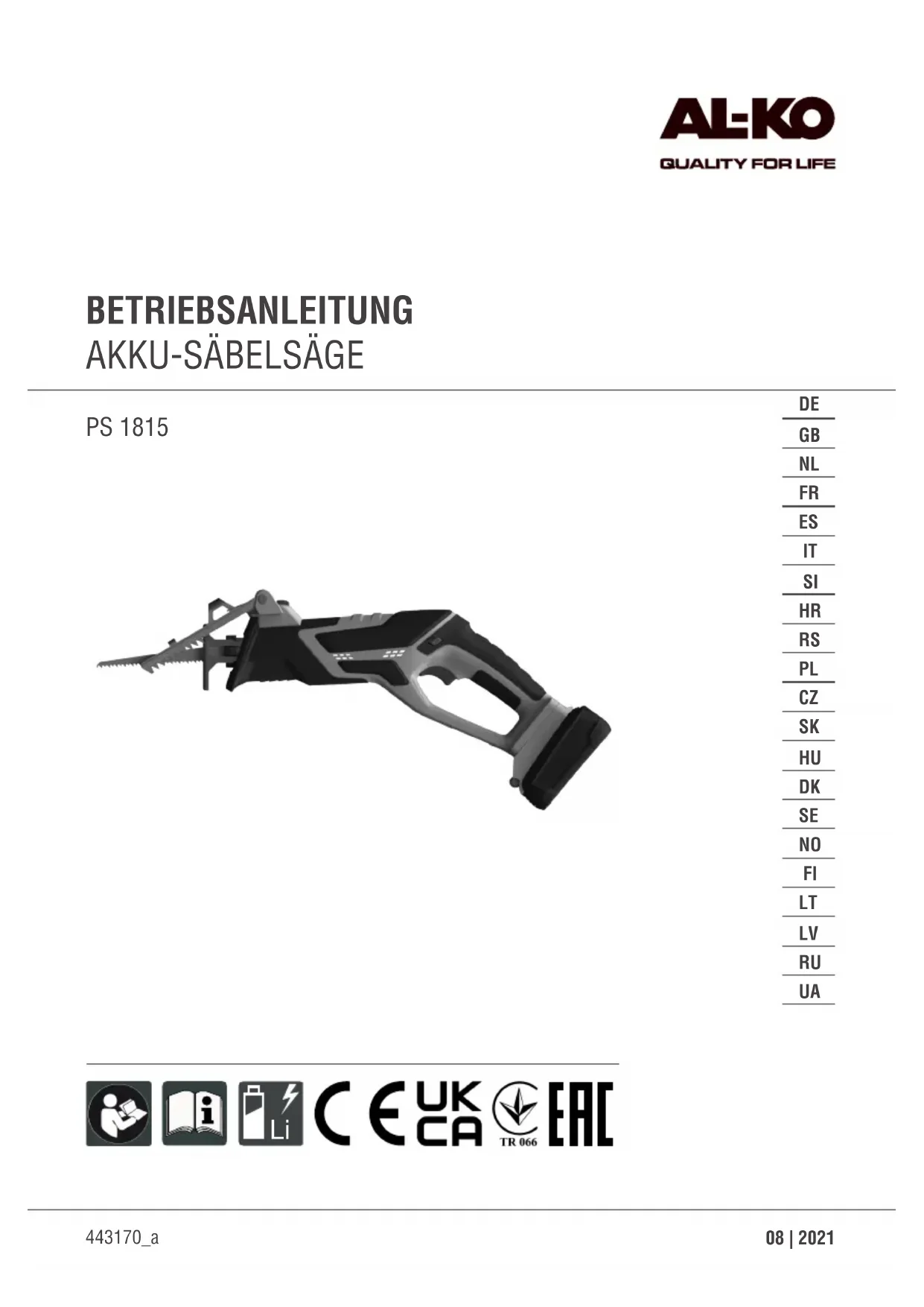 La livraison comprend tous les articles énumérés ci-dessous. Vérifier que tous les articles sont contenus dans la livraison: N° Pièce 1 Scie-sabre sans fil 2 Étrier de maintien 3 Lame de scie pour bois 4 Lame de scie pour les métaux 5 Lame de scie pour les plastiques 6 Notice d’utilisation «Scie-sabre sans fil» REMARQUE La batterie et le chargeur ne sont pas compris dans la livraison et doivent donc être commandés séparément.FR 44 PS 1815 Consignes de sécurité