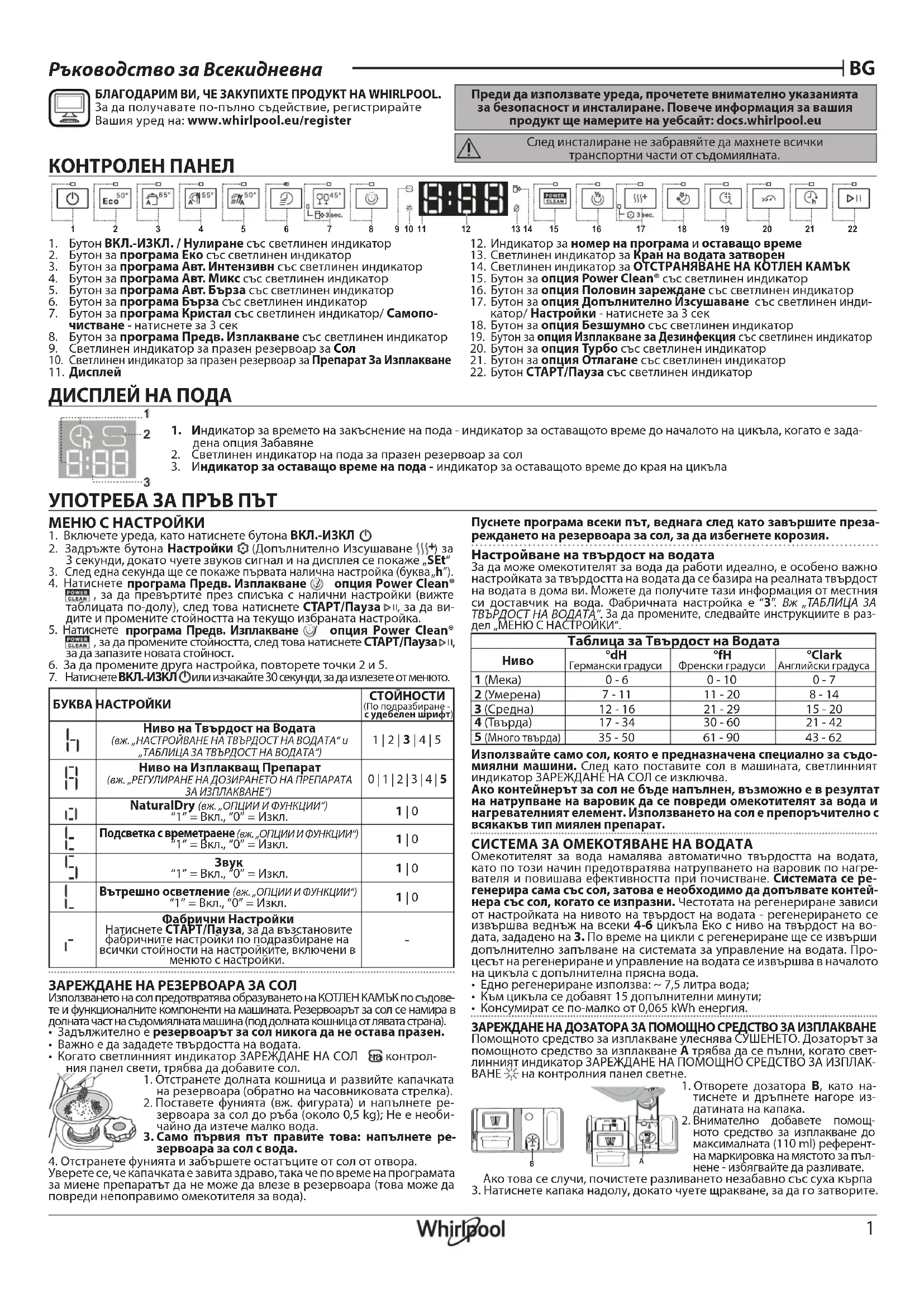 Avant d’utiliser l’appareil, il convient de lire attentivement les consignes de sécurité et d’installation. Pour en savoir plus concernant votre produit, consulter le site Internet : docs.whirlpool.eu Après l’installation, rappelez-vous d’enlever toutes les pièces de protection pour le transport du lave-vaisselle.