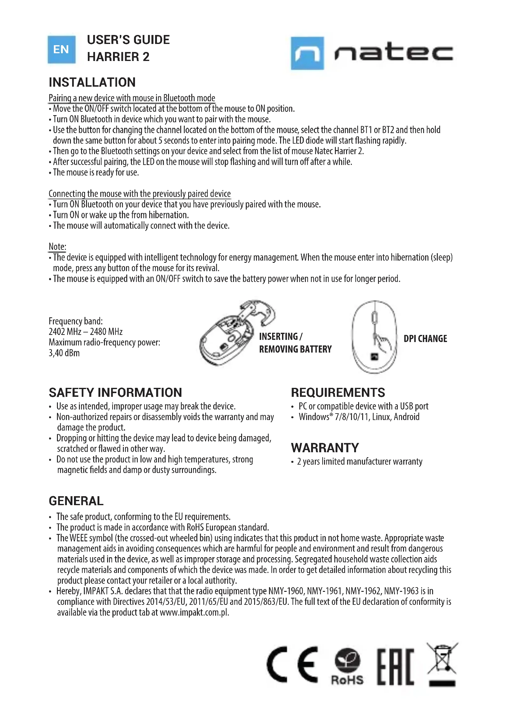 - La souris est équipée d'un interrupteur Marche/Arrêt pour économiser la pile lorsqu'il n'est pas utilisé pendant une longue période. Bande de fréquences: 2402 – 2480 MHz Puissance de radiofréquence maximale transmise: 3,40 dBm INSTALLATION