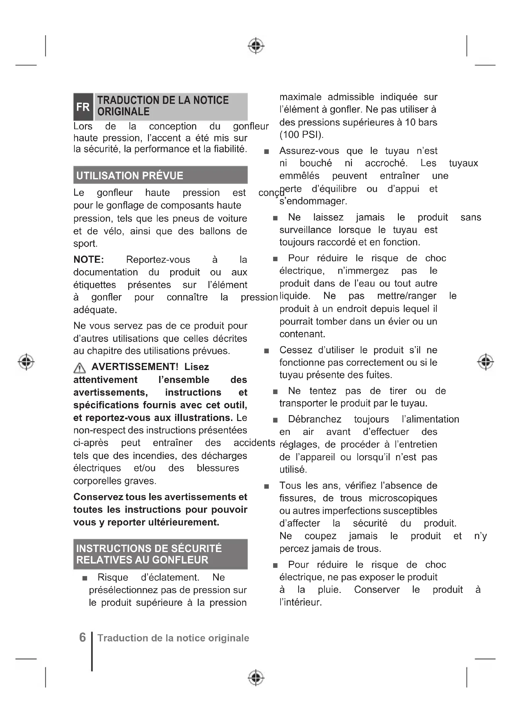 /H JRQÀHXU KDXWH SUHVVLRQ HVW FRQoX SRXUOHJRQÀDJHGHFRPSRVDQWVKDXWH pression, tels que les pneus de voiture et de vélo, ainsi que des ballons de VSRUW NOTE: Reportez-vous à la documentation du produit ou aux étiquettes présentes sur l’élément j JRQÀHU SRXU FRQQDvWUH OD SUHVVLRQ DGpTXDWH Ne vous servez pas de ce produit pour d’autres utilisations que celles décrites DXFKDSLWUHGHVXWLOLVDWLRQVSUpYXHV AVERTISSEMENT! Lisez attentivement l’ensemble des avertissements, instructions et spécifications fournis avec cet outil, et reportez-vous aux illustrations. Le non-respect des instructions présentées FLDSUqV SHXW HQWUDvQHU GHV DFFLGHQWV tels que des incendies, des décharges pOHFWULTXHV HWRX GHV EOHVVXUHV FRUSRUHOOHVJUDYHV Conservez tous les avertissements et toutes les instructions pour pouvoir vous y reporter ultérieurement.