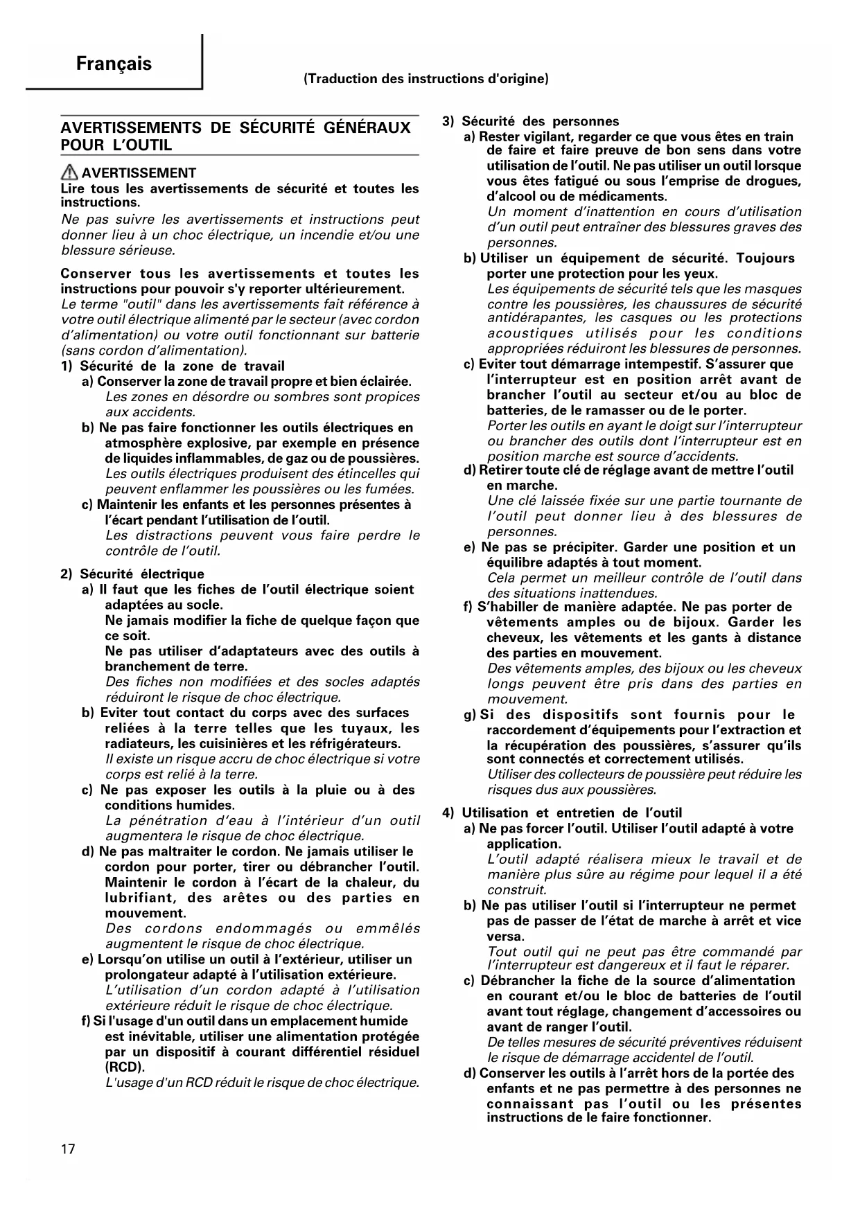 AVERTISSEMENT Lire tous les avertissements de sécurité et toutes les instructions. Ne pas suivre les avertissements et instructions peut donner lieu à un choc électrique, un incendie et/ou une blessure sérieuse. Conserver tous les avertissements et toutes les instructions pour pouvoir s'y reporter ultérieurement. Le terme "outil" dans les avertissements fait référence à votre outil électrique alimenté par le secteur (avec cordon d’alimentation) ou votre outil fonctionnant sur batterie (sans cordon d’alimentation).
