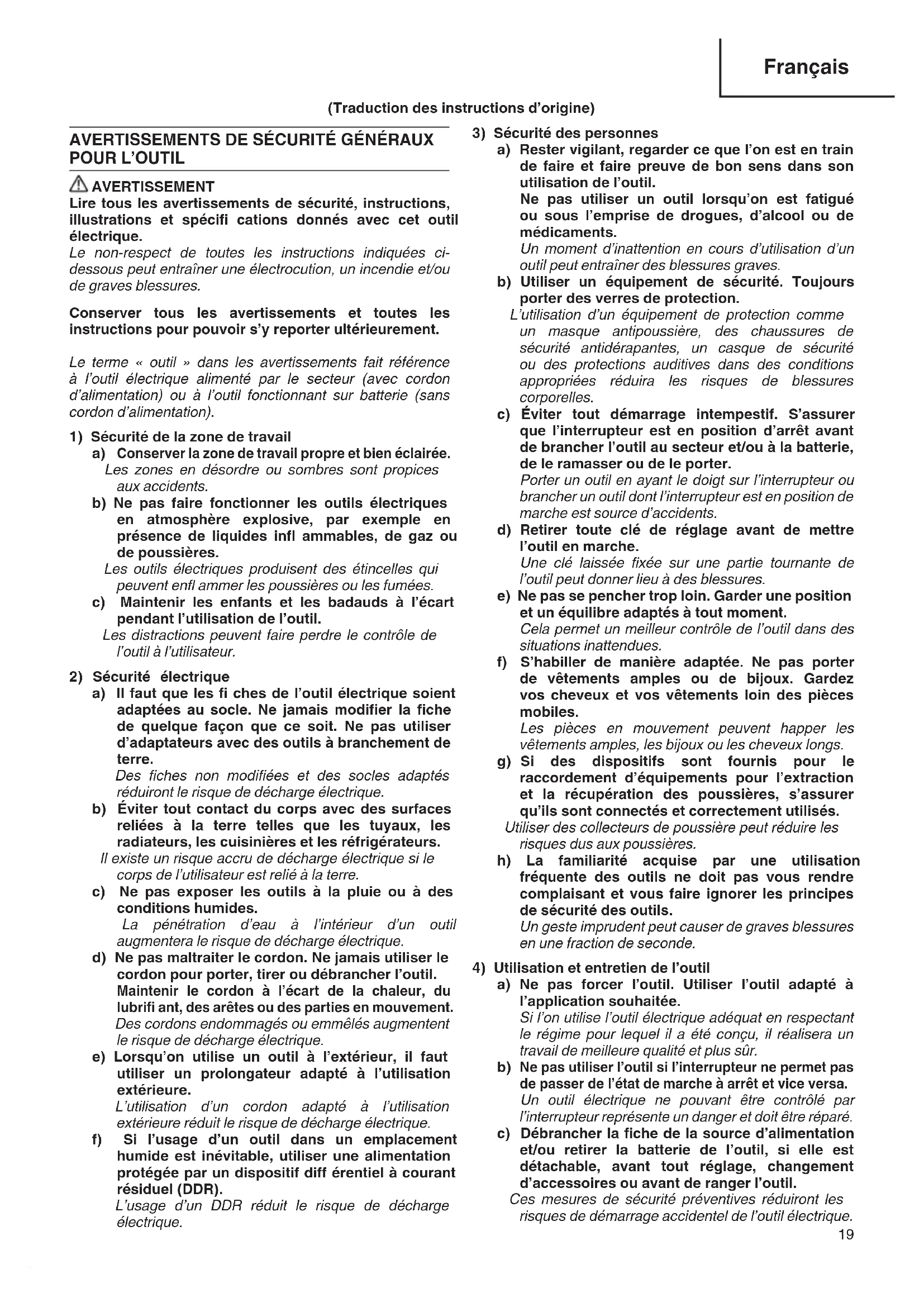 a) Rester vigilant, regarder ce que l’on est en train de faire et faire preuve de bon sens dans son utilisation de l’outil. Ne pas utiliser un outil lorsqu’on est fatigué ou sous l’emprise de drogues, d’alcool ou de médicaments. Un moment d’inattention en cours d’utilisation d’un outil peut entraîner des blessures graves. b) Utiliser un équipement de sécurité. Toujours porter des verres de protection. L’utilisation d’un équipement de protection comme un masque antipoussière, des chaussures de sécurité antidérapantes, un casque de sécurité ou des protections auditives dans des conditions appropriées réduira les risques de blessures corporelles. c) Éviter tout démarrage intempestif. S’assurer que l’interrupteur est en position d’arrêt avant de brancher l’outil au secteur et/ou à la batterie, de le ramasser ou de le porter. Porter un outil en ayant le doigt sur l’interrupteur ou brancher un outil dont l’interrupteur est en position de marche est source d’accidents. d) Retirer toute clé de réglage avant de mettre l’outil en marche. Une clé laissée fi xée sur une partie tournante de l’outil peut donner lieu à des blessures. e) Ne pas se pencher trop loin. Garder une position et un équilibre adaptés à tout moment. Cela permet un meilleur contrôle de l’outil dans des situations inattendues. f) S’habiller de manière adaptée. Ne pas porter de vêtements amples ou de bijoux. Gardez vos cheveux et vos vêtements loin des pièces mobiles. Les pièces en mouvement peuvent happer les vêtements amples, les bijoux ou les cheveux longs. g) Si des dispositifs sont fournis pour le raccordement d’équipements pour l’extraction et la récupération des poussières, s’assurer qu’ils sont connectés et correctement utilisés. Utiliser des collecteurs de poussière peut réduire les risques dus aux poussières. h) La familiarité acquise par une utilisation fréquente des outils ne doit pas vous rendre complaisant et vous faire ignorer les principes de sécurité des outils. Un geste imprudent peut causer de graves blessures en une fraction de seconde.