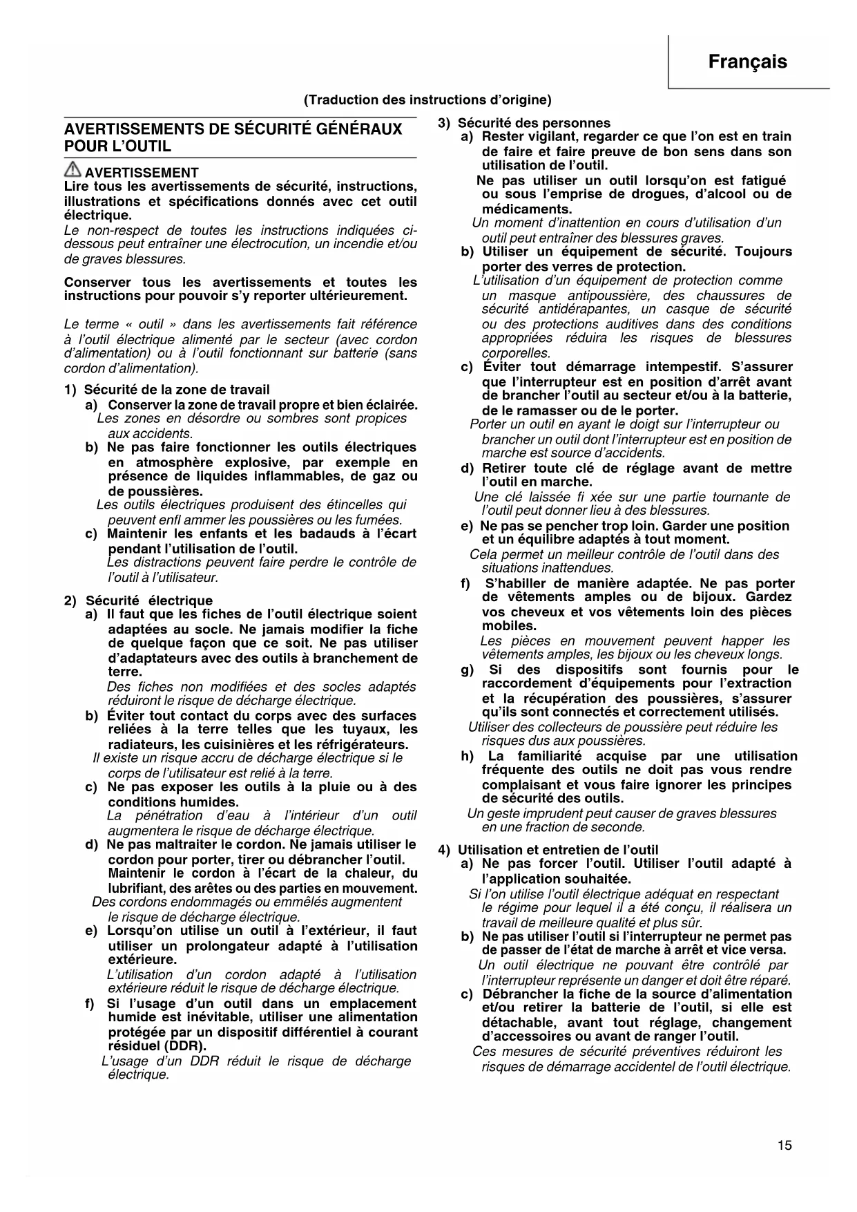 Ne pas utiliser l’outil si l’interrupteur ne permet pas de passer de l’état de marche à arrêt et vice versa. Un outil électrique ne pouvant être contrôlé par l’interrupteur représente un danger et doit être réparé. c) Débrancher la fi che de la source d’alimentation et/ou retirer la batterie de l’outil, si elle est détachable, avant tout réglage, changement d’accessoires ou avant de ranger l’outil. Ces mesures de sécurité préventives réduiront les risques de démarrage accidentel de l’outil électrique. AVERTISSEMENTS DE SÉCURITÉ GÉNÉRAUX