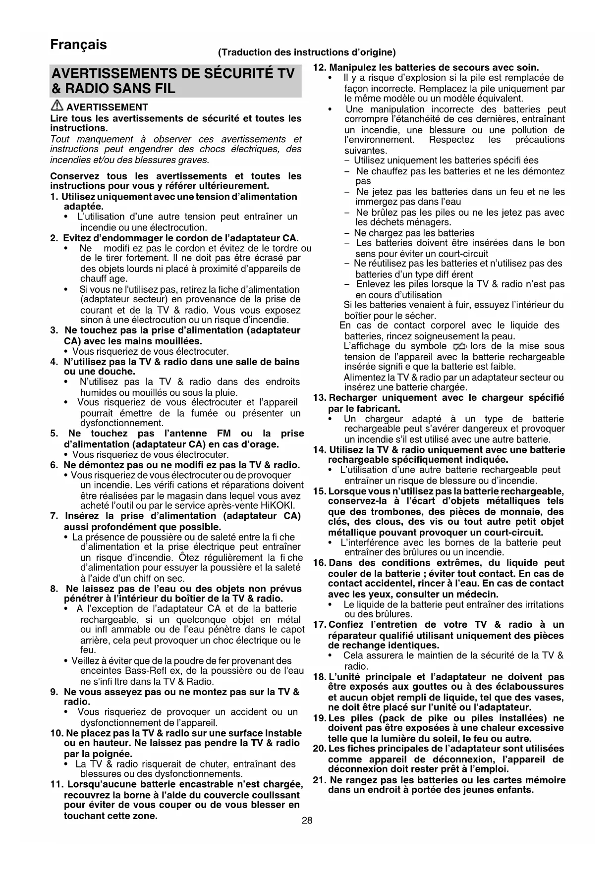 ÉQUIPEMENT EXTERNE Des problèmes inattendus peuvent entraîner la perte ou l’endommagement des données stockées dans les smartphones et autres équipements périphériques connectés à la TV & radio. En conséquence de cela, une sauvegarde des données devrait toujours être faite à l’avance. Notez que HiKOKI ne peut être tenu responsable de la corruption ou de la perte des données stockées dans les smartphones et autres équipements périphériques connectés à la TV & radio, ni de tout dommage à l’équipement lui-même.