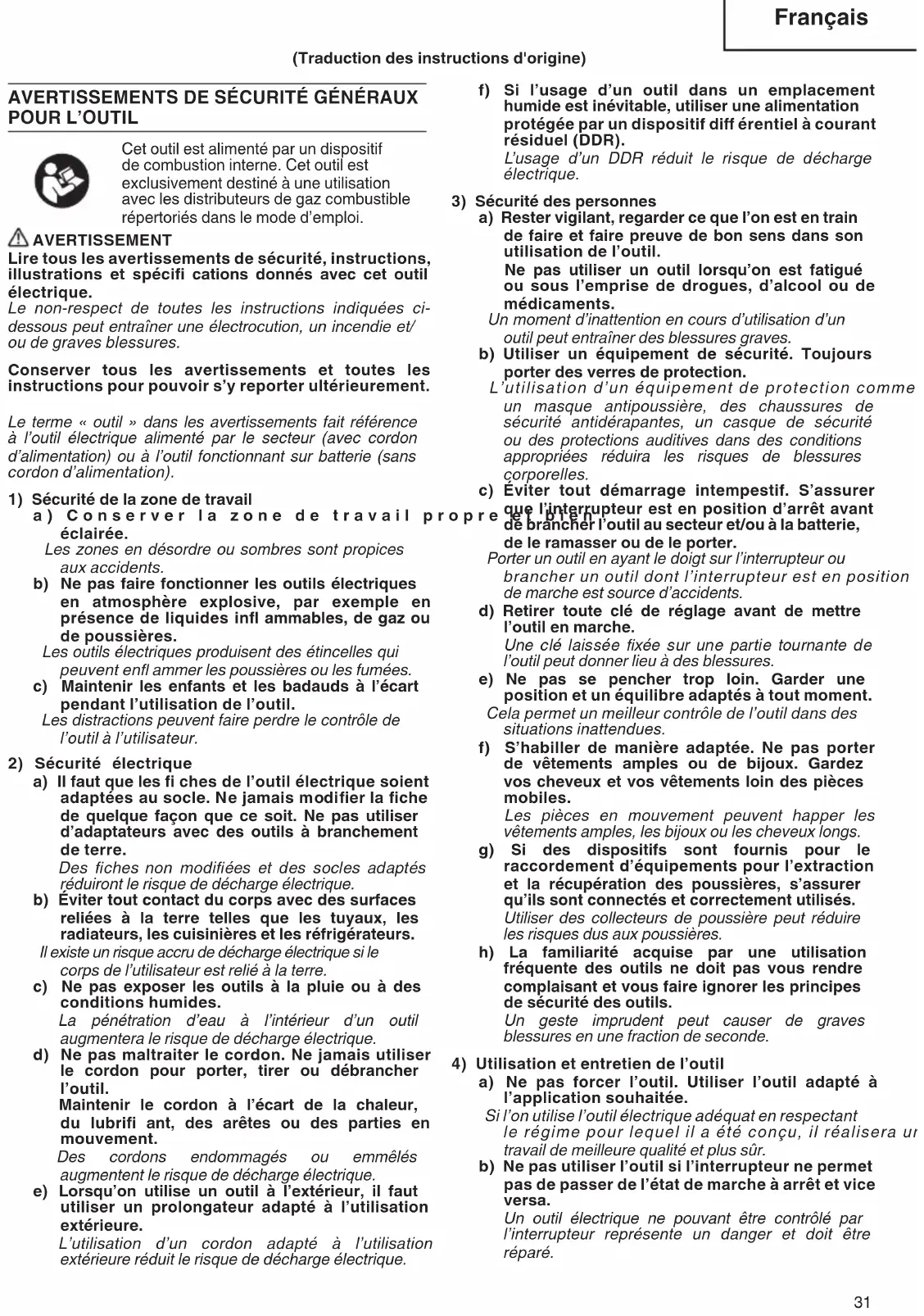 Cet outil est alimenté par un dispositif de combustion interne. Cet outil est exclusivement destiné à une utilisation avec les distributeurs de gaz combustible répertoriés dans le mode d’emploi. AVERTISSEMENT Lire tous les avertissements de sécurité, instructions, illustrations et spécifi cations donnés avec cet outil électrique. Le non-respect de toutes les instructions indiquées ci- dessous peut entraîner une électrocution, un incendie et/ ou de graves blessures. Conserver tous les avertissements et toutes les instructions pour pouvoir s’y reporter ultérieurement. Le terme « outil » dans les avertissements fait référence à l’outil électrique alimenté par le secteur (avec cordon d’alimentation) ou à l’outil fonctionnant sur batterie (sans cordon d’alimentation).