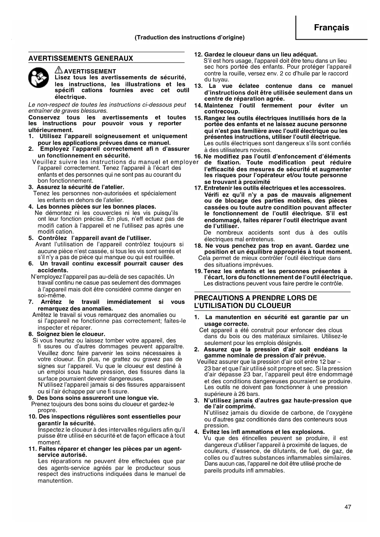 usage correcte. Cet appareil a été construit pour enfoncer des clous dans du bois ou des matériaux similaires. Utilisez-le seulement pour les emplois désignés.