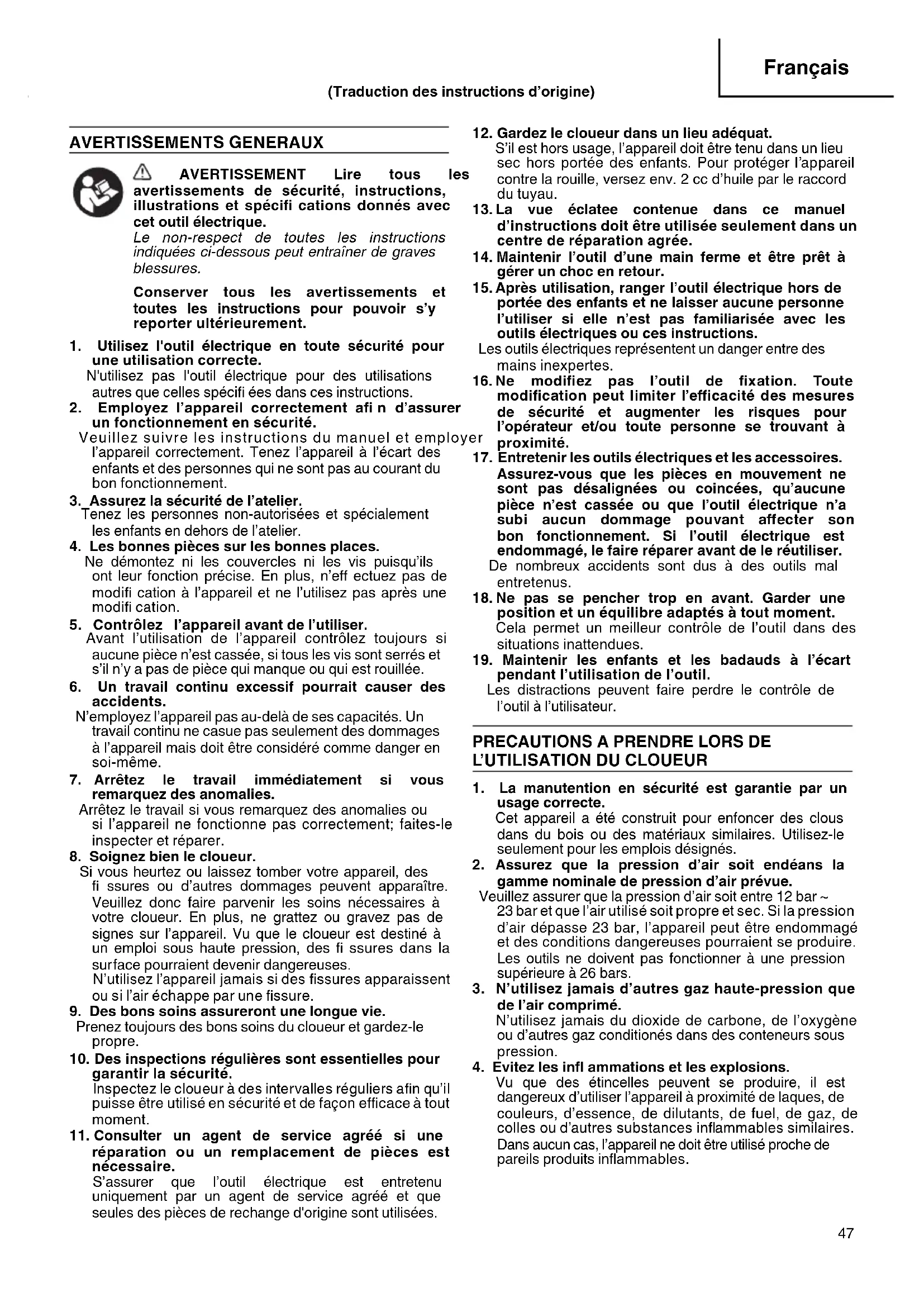 usage correcte. Cet appareil a été construit pour enfoncer des clous dans du bois ou des matériaux similaires. Utilisez-le seulement pour les emplois désignés.