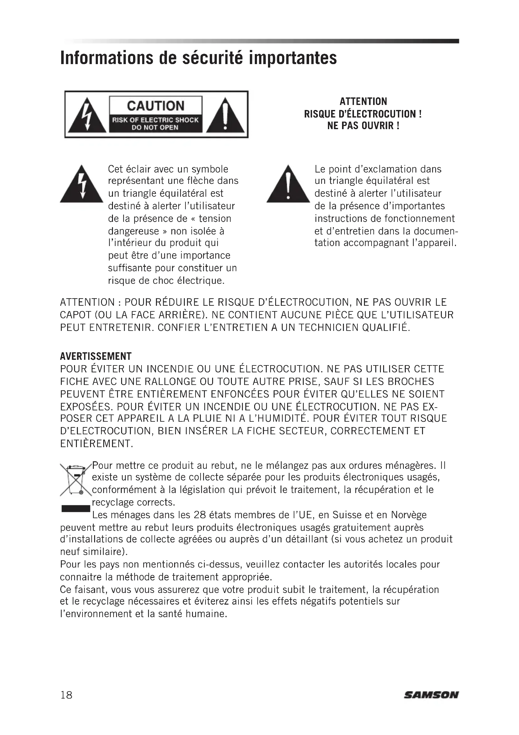 System Working Range 300' (100m) line of sight Audio Frequency Response 50 Hz - 15 kHz T.H.D. (Overall) <1% (@AF 1 kHz, RF 46 dBu) Dynamic Range >100 dB A-weighted Signal to Noise >95 dB Operating Temperature –10°C (14°F) to +60°C (+140°F) Tone Key Frequency 32.768 kHz ATX Microphone Transmitter Input Connector Mini-XLR (P3) Input Impedance 3kΩ Input Gain Range 20dB RF Power 10mW EIRP Power Requirements 3.6V 500mAh Lithium Ion rechargeable battery Battery Life 8 hours Dimensions (LxWxH) 5.9” x 6.7” x 3.9” 150mm x 170mm x 100mm Weight 0.13lb / 60g CR99 Receiver Audio Output Level - Unbalanced +14 dBu Audio Output Level - Balanced +9 dBu Audio Output Impedance - Unbalanced 810 Ohms Audio Output Impedance - Balanced 240 Ohms Sensitivity -100 dBm / 30 dB sinad Image Rejection >50 dB Operating Voltage 15 VDC 200mA Dimensions (LxWxH) 7.87” x 5.9” x 1.6” 200mm x 150mm x 42mm Weight 2.08lb / 0.946kg At Samson, we are continually improving our products, therefore specifications and images are subject to change without notice. Specifications18 Informations de sécurité importantes ATTENTION: POUR RÉDUIRE LE RISQUE D’ÉLECTROCUTION, NE PAS OUVRIR LE CAPOT (OU LA FACE ARRIÈRE). NE CONTIENT AUCUNE PIÈCE QUE L’UTILISATEUR PEUT ENTRETENIR. CONFIER L’ENTRETIEN A UN TECHNICIEN QUALIFIÉ. Cet éclair avec un symbole représentant une flèche dans un triangle équilatéral est destiné à alerter l’utilisateur de la présence de «tension dangereuse» non isolée à l’intérieur du produit qui peut être d’une importance suffisante pour constituer un risque de choc électrique. Le point d’exclamation dans un triangle équilatéral est destiné à alerter l’utilisateur de la présence d’importantes instructions de fonctionnement et d’entretien dans la documen- tation accompagnant l’appareil. ATTENTION RISQUE D’ÉLECTROCUTION ! NE PAS OUVRIR ! AVERTISSEMENT POUR ÉVITER UN INCENDIE OU UNE ÉLECTROCUTION. NE PAS UTILISER CETTE FICHE AVEC UNE RALLONGE OU TOUTE AUTRE PRISE, SAUF SI LES BROCHES PEUVENT ÊTRE ENTIÈREMENT ENFONCÉES POUR ÉVITER QU’ELLES NE SOIENT EXPOSÉES. POUR ÉVITER UN INCENDIE OU UNE ÉLECTROCUTION. NE PAS EX- POSER CET APPAREIL A LA PLUIE NI A L’HUMIDITÉ. POUR ÉVITER TOUT RISQUE D’ELECTROCUTION, BIEN INSÉRER LA FICHE SECTEUR, CORRECTEMENT ET ENTIÈREMENT. Pour mettre ce produit au rebut, ne le mélangez pas aux ordures ménagères. Il existe un système de collecte séparée pour les produits électroniques usagés, conformément à la législation qui prévoit le traitement, la récupération et le recyclage corrects. Les ménages dans les 28 états membres de l’UE, en Suisse et en Norvège peuvent mettre au rebut leurs produits électroniques usagés gratuitement auprès d’installations de collecte agréées ou auprès d’un détaillant (si vous achetez un produit neuf similaire). Pour les pays non mentionnés ci-dessus, veuillez contacter les autorités locales pour connaitre la méthode de traitement appropriée. Ce faisant, vous vous assurerez que votre produit subit le traitement, la récupération et le recyclage nécessaires et éviterez ainsi les effets négatifs potentiels sur l’environnement et la santé humaine.Système sans fil ATX AirLine 19