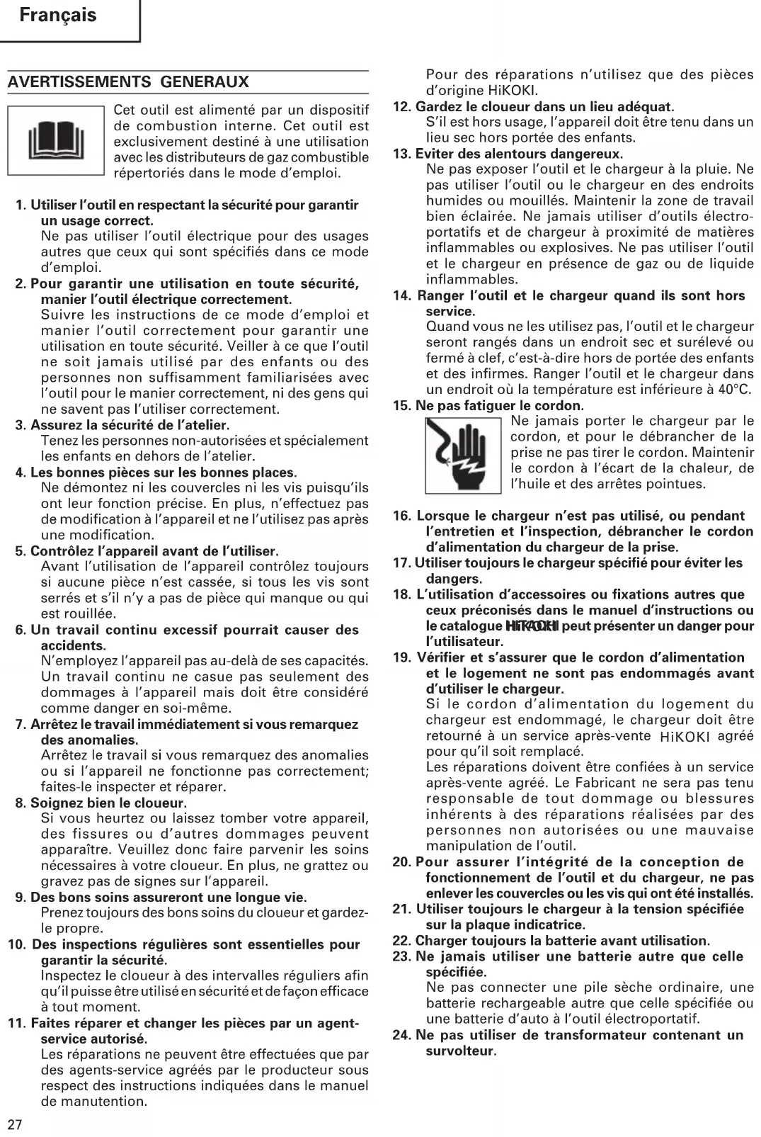 et le logement ne sont pas endommagés avant d’utiliser le chargeur. Si le cordon d’alimentation du logement du chargeur est endommagé, le chargeur doit être retourné à un service après-vente HITACHI agréé pour qu’il soit remplacé. Les réparations doivent être confiées à un service après-vente agréé. Le Fabricant ne sera pas tenu responsable de tout dommage ou blessures inhérents à des réparations réalisées par des personnes non autorisées ou une mauvaise manipulation de l’outil.