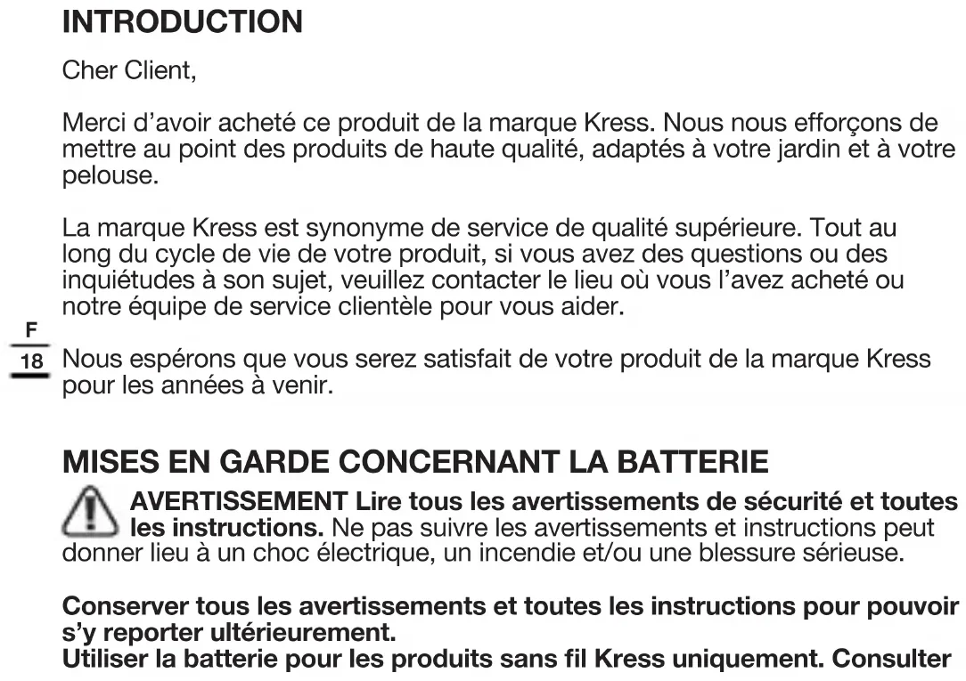 INTRODUCTION Cher Client, Merci d’avoir acheté ce produit de la marque Kress. Nous nous efforçons de mettre au point des produits de haute qualité, adaptés à votre jardin et à votre pelouse. La marque Kress est synonyme de service de qualité supérieure. Tout au long du cycle de vie de votre produit, si vous avez des questions ou des inquiétudes à son sujet, veuillez contacter le lieu où vous l’avez acheté ou notre équipe de service clientèle pour vous aider. Nous espérons que vous serez satisfait de votre produit de la marque Kress pour les années à venir.