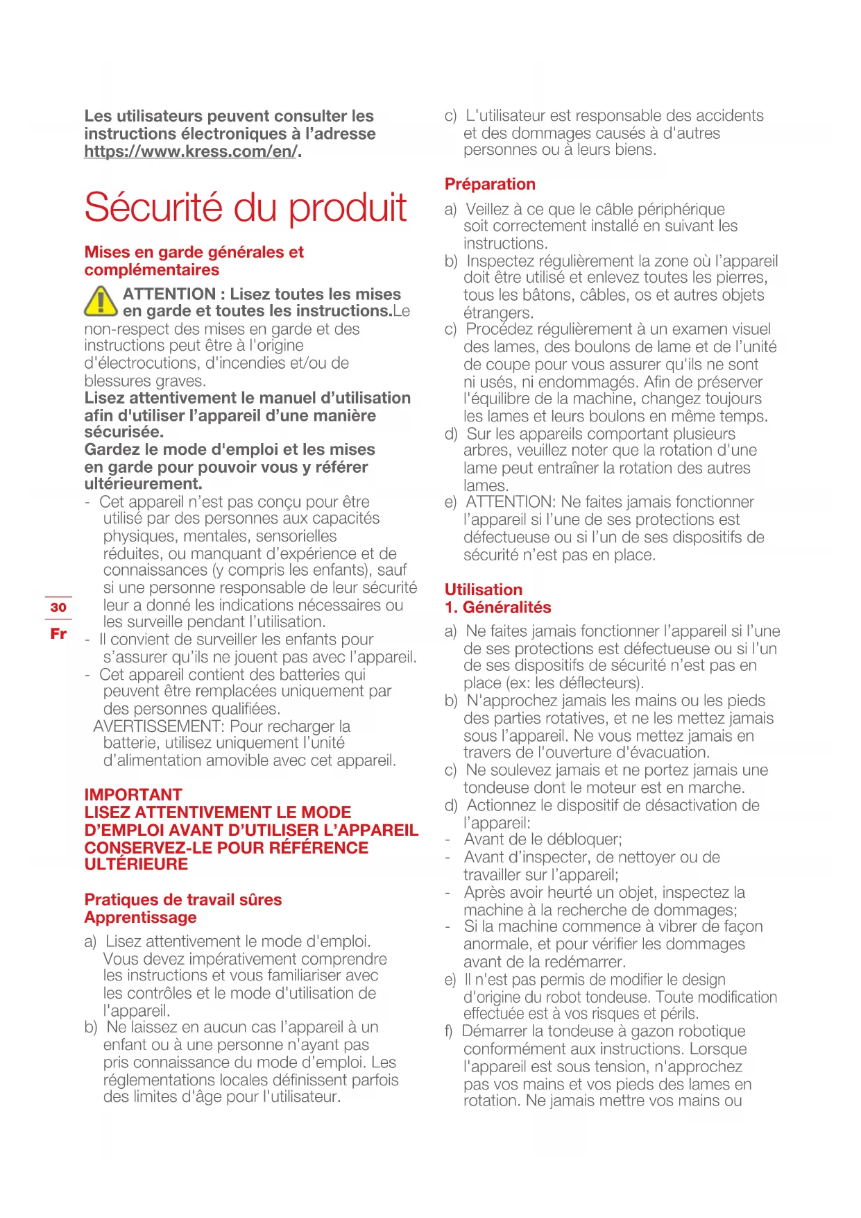 Les utilisateurs peuvent consulter les instructions électroniques à l’adresse https://www.kress.com/en/. Sécurité du produit Mises en garde générales et complémentaires ATTENTION : Lisez toutes les mises en garde et toutes les instructions.Le non-respect des mises en garde et des instructions peut être à l'origine d'électrocutions, d'incendies et/ou de blessures graves. Lisez attentivement le manuel d’utilisation afin d'utiliser l’appareil d’une manière sécurisée. Gardez le mode d'emploi et les mises en garde pour pouvoir vous y référer ultérieurement. - Cet appareil n’est pas conçu pour être utilisé par des personnes aux capacités physiques, mentales, sensorielles réduites, ou manquant d’expérience et de connaissances (y compris les enfants), sauf si une personne responsable de leur sécurité leur a donné les indications nécessaires ou les surveille pendant l’utilisation. - Il convient de surveiller les enfants pour s’assurer qu’ils ne jouent pas avec l’appareil. - Cet appareil contient des batteries qui peuvent être remplacées uniquement par des personnes qualifiées.