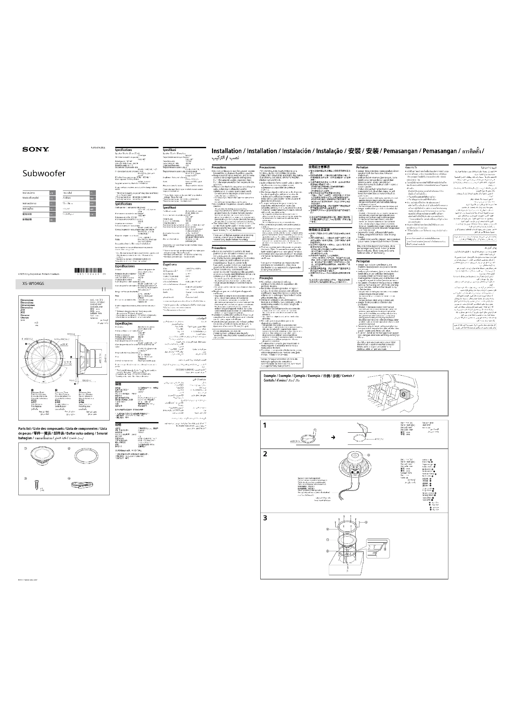 Precautions• Do not continuously use the speaker system beyond the peak power handling capacity.• Keep recorded tapes, watches, and personal credit cards using magnetic coding away from the speaker system to protect them from damage caused by the magnets in the speakers.• Please note the following when installing the units; otherwise malfunction and/or deterioration in sound quality may result. – Do not touch the diaphragms and/or speaker cones by hand or with tools. – Do not put your fingers through the holes of the frame. – Do not drop foreign objects in the units.• Do not place this product close to medical devices. – This product (including accessories) has magnet(s) which may interfere with pacemakers, programmable shunt valves for hydrocephalus treatment, or other medical devices. Do not place this product close to persons who use such medical devices. Consult your doctor before using this product if you use any such medical device.• The subwoofer is heavy, so attach it firmly to a solid thick, baffle plate or metal board.• Make a woofer box, using wooden boards at least 18 mm ( /32 in) thickness.If you cannot find an appropriate mounting location, consult your car dealer or your nearest Sony dealer before mounting.Précautions• Evitez de soumettre le système de haut-parleurs à une utilisation continue au-delà de la puissance de crête admissible.• Gardez les bandes enregistrées, les montres et les cartes de crédit utilisant un code magnétique à l’écart du système de haut-parleurs pour éviter tout dommage causé par les aimants des haut-parleurs.• Tenez compte des recommandations suivantes lors de l’installation des appareils ; sinon vous risquez une défaillance et/ou une détérioration de la qualité du son. – Ne touchez pas les diaphragmes et/ou les cônes des haut-parleurs avec la main ou des outils. – Ne glissez pas les doigts à travers les trous du cadre. – Ne laissez pas tomber de corps étrangers dans les appareils.• Ne placez pas ce produit près d’appareils médicaux. – Ce produit (y compris les accessoires) comporte un ou des aimants qui peuvent perturber les stimulateurs cardiaques, les valves de dérivation programmables pour le traitement de l’hydrocéphalie ou d’autres appareils médicaux. Ne placez pas ce produit près de personnes utilisant ce type d’appareil médical. Consultez votre médecin avant d’utiliser ce produit si vous utilisez ce type d’appareil médical.• Comme le subwoofer est lourd, fixez-le sur une planche pour baffle épaisse et robuste ou sur une plaque métallique.• Construisez un caisson pour le haut-parleur de graves à l’aide de lattes en bois d’une épaisseur d’au moins 18 mm ( /32 po).Si vous ne pouvez pas trouver d’emplacement adéquat pour installer l’appareil, consultez votre revendeur Sony le plus proche. Installation / Installation / Instalación / Instalação / / / Pemasangan / Pemasangan / /