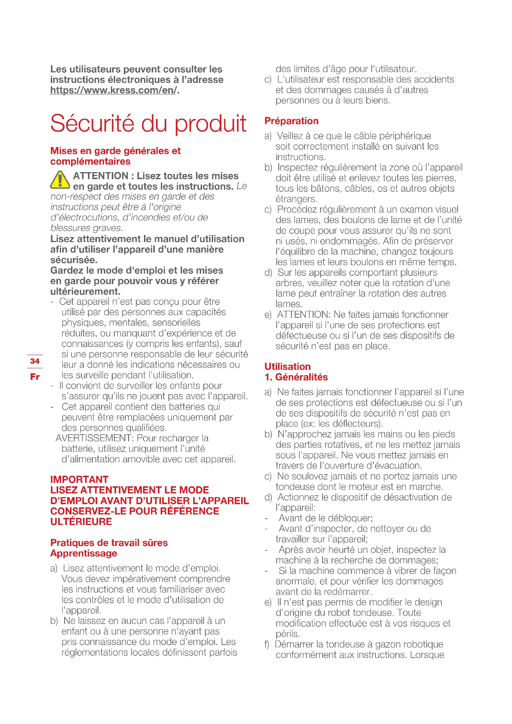 Les utilisateurs peuvent consulter les instructions électroniques à l’adresse https://www.kress.com/en/. Sécurité du produit Mises en garde générales et complémentaires ATTENTION : Lisez toutes les mises en garde et toutes les instructions.
