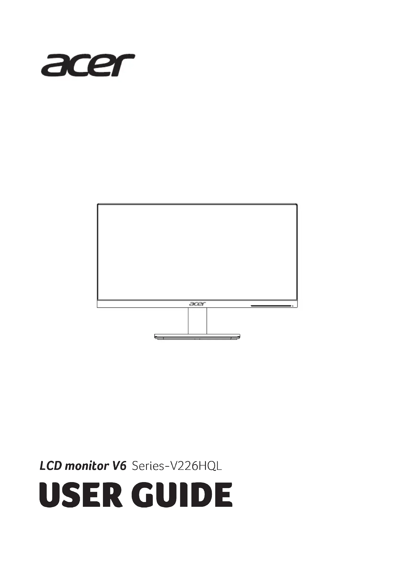 Connexion du moniteur à votre ordinateur Contenu du paquet Moniteur LCDAdaptateur/ligned'alimentationSupport/Base Câble VGA/HDMI (en option)Guide de démarrage rapide USER GUIDE Guide de démarrage rapide du moniteur LCD Acer Instructions de sécurité importantes Veuillez lire attentivement les instructions suivantes.1. Pour nettoyer l’écran du moniteur LCD : • Éteignez le moniteur LCD et débranchez le cordon d’alimentation. • 2. Ne placez pas le moniteur LCD près d’une fenêtre. L’exposition du moniteur à la pluie, l’humidité ou la lumière de soleil peut l’endommager sérieusement. 3. N’appliquez pas de pression sur l’écran LCD. Une pression excessive peut endommager de façon permanente l’écran.4. N’enlevez pas le couvercle et n’essayez pas de réparer l’unité vous-même. Seul un technicien agrée est 5. Stockez l’écran LCD dans une pièce dont la température est comprise entre -20° et 60 °C. Stocker le moniteur LCD dans un environnement dont les températures sont hors plage peut l’endommager de façon permanente. 6. Débranchez immédiatement votre moniteur et appelez un technicien agrée dans les situations suivantes : • Le câble signal reliant le moniteur au PC est éraillé ou endommagé. • Du liquide a coulé sur le moniteur LCD ou le moniteur a été exposé à la pluie. • Le moniteur LCD ou le bâti est endommagé. Français LCD monitor V6 Series-V226HQLEnglish