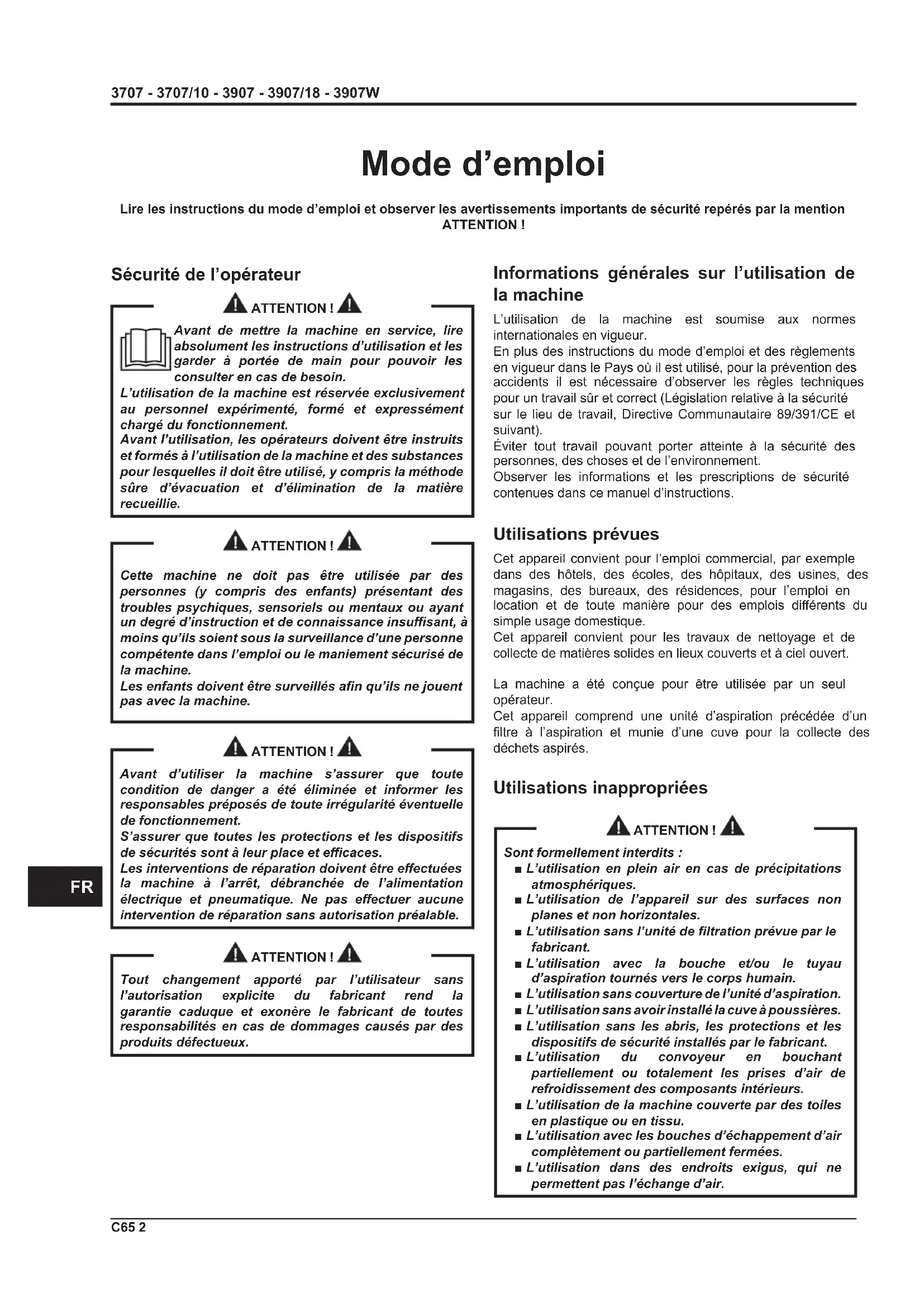 Mode d’emploi Informations générales sur l’utilisation de la machine L’utilisation de la machine est soumise aux normes internationales en vigueur. En plus des instructions du mode d’emploi et des règlements en vigueur dans le Pays où il est utilisé, pour la prévention des accidents il est nécessaire d’observer les règles techniques pour un travail sûr et correct (Législation relative à la sécurité sur le lieu de travail, Directive Communautaire 89/391/CE et suivant). Éviter tout travail pouvant porter atteinte à la sécurité des personnes, des choses et de l’environnement. Observer les informations et les prescriptions de sécurité contenues dans ce manuel d’instructions. Utilisations prévues Cet appareil convient pour l’emploi commercial, par exemple dans des hôtels, des écoles, des hôpitaux, des usines, des magasins, des bureaux, des résidences, pour l’emploi en location et de toute manière pour des emplois diérents du simple usage domestique. Cet appareil convient pour les travaux de nettoyage et de collecte de matières solides en lieux couverts et à ciel ouvert. La machine a été conçue pour être utilisée par un seul opérateur. Cet appareil comprend une unité d’aspiration précédée d’un ltre à l’aspiration et munie d’une cuve pour la collecte des déchets aspirés. Utilisations inappropriées ATTENTION ! Sont formellement interdits : ■ L’utilisation en plein air en cas de précipitations atmosphériques. ■ L’utilisation de l’appareil sur des surfaces non planes et non horizontales. ■ L’utilisation sans l’unité de ltration prévue par le fabricant. ■ L’utilisation avec la bouche et/ou le tuyau d’aspiration tournés vers le corps humain. ■ L’utilisation sans couverture de l’unité d’aspiration. ■ L’utilisation sans avoir installé la cuve à poussières. ■ L’utilisation sans les abris, les protections et les dispositifs de sécurité installés par le fabricant. ■ L’utilisation du convoyeur en bouchant partiellement ou totalement les prises d’air de refroidissement des composants intérieurs. ■ L’utilisation de la machine couverte par des toiles en plastique ou en tissu. ■ L’utilisation avec les bouches d’échappement d’air complètement ou partiellement fermées. ■ L’utilisation dans des endroits exigus, qui ne permettent pas l’échange d’air. Lire les instructions du mode d’emploi et observer les avertissements importants de sécurité repérés par la mention ATTENTION ! Sécurité de l’opérateur ATTENTION ! Avant de mettre la machine en service, lire absolument les instructions d’utilisation et les garder à portée de main pour pouvoir les consulter en cas de besoin. L’utilisation de la machine est réservée exclusivement au personnel expérimenté, formé et expressément chargé du fonctionnement. Avant l’utilisation, les opérateurs doivent être instruits et formés à l’utilisation de la machine et des substances pour lesquelles il doit être utilisé, y compris la méthode sûre d’évacuation et d’élimination de la matière recueillie. ATTENTION ! Cette machine ne doit pas être utilisée par des personnes (y compris des enfants) présentant des troubles psychiques, sensoriels ou mentaux ou ayant un degré d’instruction et de connaissance insusant, à moins qu’ils soient sous la surveillance d’une personne compétente dans l’emploi ou le maniement sécurisé de la machine. Les enfants doivent être surveillés an qu’ils ne jouent pas avec la machine. ATTENTION ! Avant d’utiliser la machine s’assurer que toute condition de danger a été éliminée et informer les responsables préposés de toute irrégularité éventuelle de fonctionnement. S’assurer que toutes les protections et les dispositifs de sécurités sont à leur place et ecaces. Les interventions de réparation doivent être eectuées la machine à l’arrêt, débranchée de l’alimentation électrique et pneumatique. Ne pas eectuer aucune intervention de réparation sans autorisation préalable. ATTENTION ! Tout changement apporté par l’utilisateur sans l’autorisation explicite du fabricant rend la garantie caduque et exonère le fabricant de toutes responsabilités en cas de dommages causés par des produits défectueux.3707 - 3707/10 - 3907 - 3907/18 - 3907W 3 C65