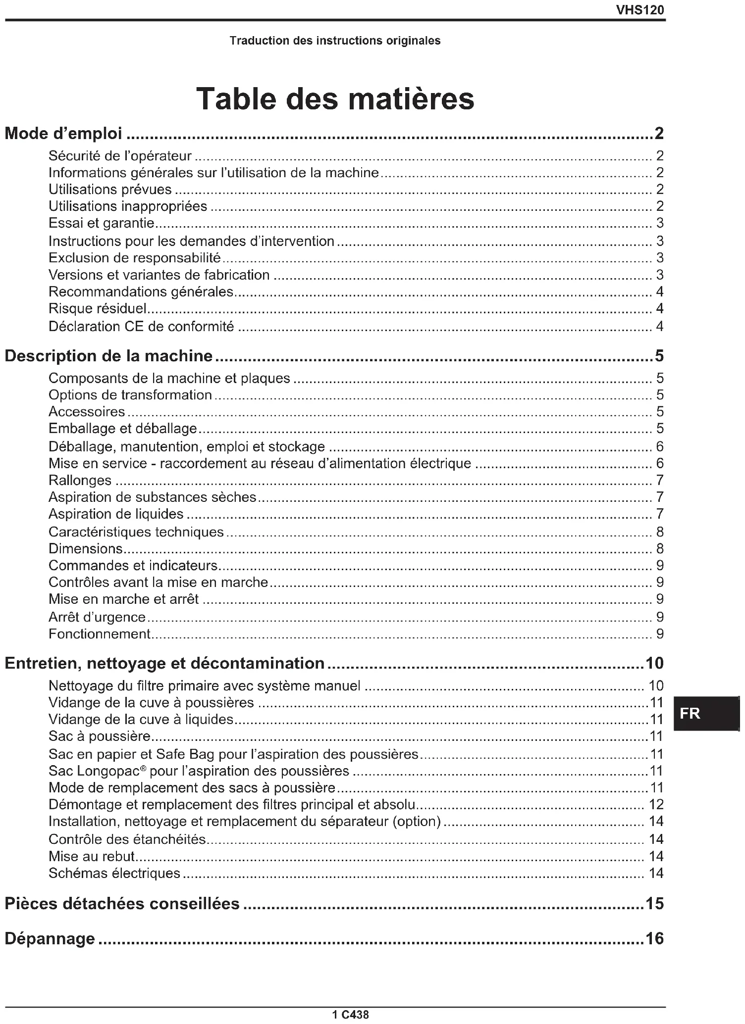 L’étiquette classe H indique en entier la mention gurant ci- dessus. ATTENTION ! Cet aspirateur contient de la poussière dangereuse pour la santé. Les opérations de vidange et d’entretien, y compris le retrait des moyens de collecte de la poussière, doivent être conées exclusivement au personnel agréé portant des vêtements de protection personnelle adaptés. Ne pas faire fonctionner sans système de ltration complet. Options de transformation Diérents types d’option de transformation de la machine sont disponibles. Sur demande, la machine peut être muni de jeux en option déjà installés. Toutefois, ils peuvent également être installés ultérieurement. Pour informations, veuillez contacter le réseau commercial. Les instructions décrivant le mode d’installation des jeux en option, leur modes de fonctionnement et d’entretien sont fournis avec ces jeux. ATTENTION ! Utiliser uniquement des options d’origine fournies et agréées. Accessoires Plusieurs accessoires sont disponibles ; veuillez consulter le catalogue des accessoires du constructeur. ATTENTION ! Utiliser uniquement des accessoires d’origine fournis et agréés par le constructeur. Emballage et déballage Le produit envoyé a été soigneusement contrôlé avant la livraison au commissionnaire de transport. Au moment de la réception de la machine, contrôler les dommages éventuels subis pendant le transport. Dans ce cas, adresser immédiatement une réclamation au transporteur.C438 6 VHS120