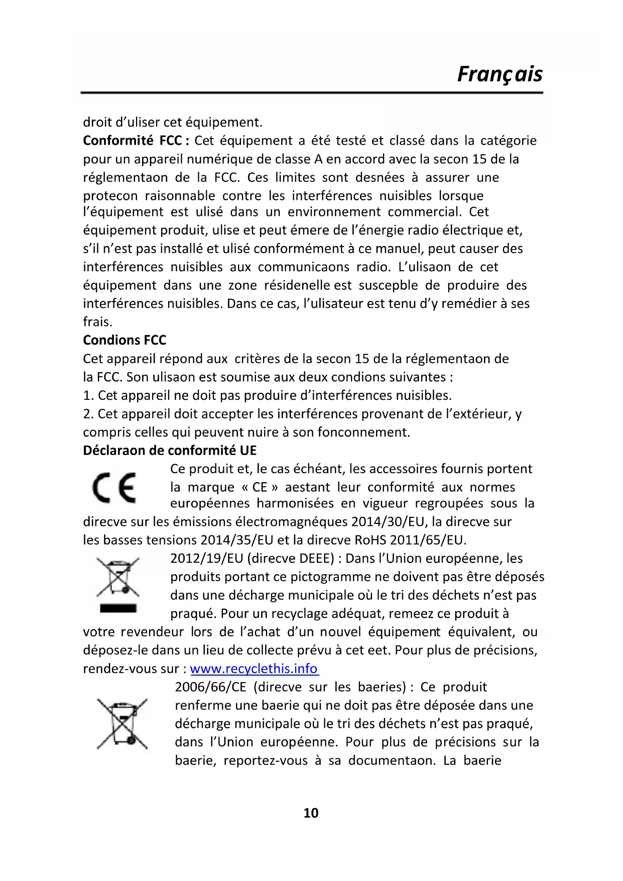 compris celles qui peuvent nuire à son fonctionnement. Déclaration de conformité UE Ce produit et, le cas échéant, les accessoires fournis portent la marque « CE » attestant leur conformité aux normes européennes harmonisées en vigueur regroupées sous la directive sur les émissions électromagnétiques 2014/30/EU, la directive sur les basses tensions 2014/35/EU et la directive RoHS 2011/65/EU. 2012/19/EU (directive DEEE) : Dans l’Union européenne, les produits portant ce pictogramme ne doivent pas être déposés dans une décharge municipale où le tri des déchets n’est pas pratiqué. Pour un recyclage adéquat, remettez ce produit à votre revendeur lors de l’achat d’un nouvel équipement équivalent, ou déposez-le dans un lieu de collecte prévu à cet effet. Pour plus de précisions, rendez-vous sur : www.recyclethis.info 2006/66/CE (directive sur les batteries) : Ce produit renferme une batterie qui ne doit pas être déposée dans une décharge municipale où le tri des déchets n’est pas pratiqué, dans l’Union européenne. Pour plus de précisions sur la batterie, reportez-vous à sa documentation. La batterieFrançais
