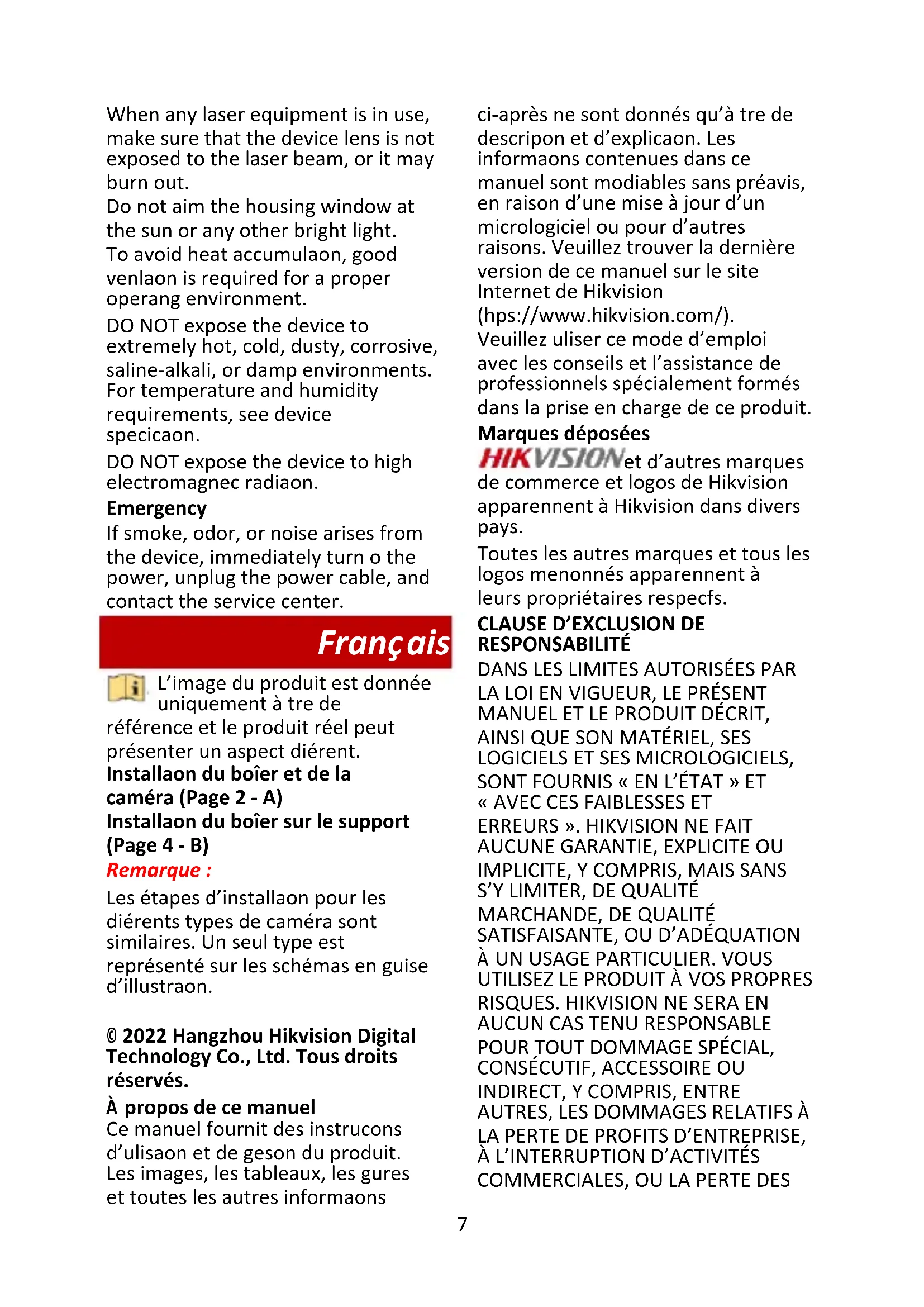 Précautions d’emploi Avertissements Lois et réglementations L’appareil doit être utilisé conformément à la législation locale ainsi qu’aux réglementations en matière de sécurité électrique et de prévention des incendies. Sécurité électrique ATTENTION : Pour réduire le risque d’incendie, remplacez-le uniquement par un fusible de même type et de même calibre. Précautions Prévention des incendies Aucune source de flamme nue, telle que des bougies allumées, ne doit être placée sur l’équipement. Installation Installez l’équipement conformément aux instructions de ce manuel. Afin d’éviter tout accident, cet appareil doit être correctement9 attaché au plafond/mur conformément aux instructions d’installation. Assurez-vous qu’il y a assez d’espace pour l’installation de l’appareil et de ses accessoires. Assurez-vous que le mur est suffisamment solide pour supporter au moins huit fois le poids de l’appareil et de son support. S’assurer que l’alimentation est coupée avant de procéder au câblage, à l’installation ou au démontage de l’appareil. Transport Gardez l’appareil dans son emballage d’origine ou dans un emballage similaire lors de son transport. Ne pas faire tomber le produit ou le soumettre à un choc physique. Alimentation électrique Utilisez un adaptateur d’alimentation fourni par un fabricant qualifié. Il est recommandé de prévoir un adaptateur d’alimentation indépendant pour chaque appareil, car toute surcharge peut entraîner un risque de surchauffe voire d’incendie. Maintenance Si le produit ne fonctionne pas correctement, contactez votre revendeur ou le centre de service le plus proche. Nous n’assumerons aucune responsabilité concernant les problèmes causés par une réparation ou une opération de maintenance non autorisée. Certains composants de l’appareil doivent être remplacés régulièrement. Leur durée de vie moyenne est variable, c’est pourquoi des contrôles périodiques sont recommandés. Veuillez contacter votre distributeur pour plus d’informations. Nettoyage Veuillez nettoyer les parois internes et externes à l’aide d’un chiffon doux et sec. N’utilisez pas de détergent alcalin. Environnement d’exploitation Pendant l’utilisation de tout équipement générant un laser, veillez à ce que l’objectif de l’appareil ne soit pas exposé au faisceau laser, car il pourrait brûler. N’orientez pas la fenêtre du boîtier vers le soleil ou toute autre lumière vive. Pour éviter l’accumulation de chaleur, une bonne aération est requise afin de fournir au produit un environnement de fonctionnement adéquat. N’exposez PAS l’appareil à des environnements extrêmement chauds, froids, poussiéreux, corrosifs, salins-alcalins ou humides. Pour les dispositions nécessaires en matière de température et d’humidité, consultez les spécifications de l’appareil. N’exposez PAS l’appareil à de puissants rayonnements électromagnétiques. Urgence Si de la fumée, des odeurs ou du bruit s’échappent de l’appareil, mettez immédiatement l’appareil hors tension et débranchez le câble d’alimentation, puis contactez un centre de réparation. Deutsch Das Erscheinungsbild des Produkts dient nur als Referenz und kann vom tatsächlichen Produkt abweichen. Installieren des Gehäuses und der Kamera (Seite 2 – A) Installieren des Gehäuses an der Halterung (Seite 4 – B) Hinweis:10 Die Installationsschritte für verschiedene Kameratypen sind ähnlich. In den Diagrammen wird ein Typ zur Veranschaulichung verwendet. © 2022 Hangzhou Hikvision Digital Technology Co., Ltd. Alle Rechte vorbehalten. Hinweise zu dieser Bedienungsanleitung Die Bedienungsanleitung enthält Anleitungen zur Verwendung und Verwaltung des Produkts. Bilder, Diagramme, Abbildungen und alle sonstigen Informationen dienen nur der Beschreibung und Erklärung. Die Änderung der in der Bedienungsanleitung enthaltenen Informationen ist aufgrund von Firmware-Aktualisierungen oder aus anderen Gründen vorbehalten. Die neueste Version dieser Bedienungsanleitung finden Sie auf der Hikvision-Website (https://www.hikvision.com/). Bitte verwenden Sie diese Bedienungsanleitung unter Anleitung und Unterstützung von Fachleuten, die für den Support des Produkts geschult sind. Markenzeichen und andere Marken sowie Logos von Hikvision sind das Eigentum von Hikvision in verschiedenen Ländern. Andere hier erwähnte Marken und Logos sind Eigentum ihrer jeweiligen Inhaber. HAFTUNGSAUSSCHLUSS