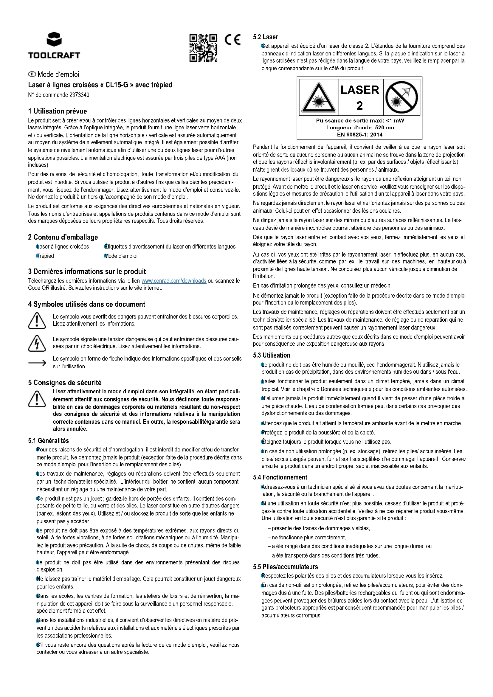 Mode d‘emploi Laser à lignes croisées « CL15-G » avec trépied N° de commande 2373340 1 Utilisation prévue Le produit sert à créer et/ou à contrôler des lignes horizontales et verticales au moyen de deux lasers intégrés. Grâce à l’optique intégrée, le produit fournit une ligne laser verte horizontale et / ou verticale. L‘orientation de la ligne horizontale / verticale est assurée automatiquement au moyen du système de nivellement automatique intégré. Il est également possible d‘arrêter le système de nivellement automatique an d‘utiliser une ou deux lignes laser pour d‘autres applications possibles. L’alimentation électrique est assurée par trois piles de type AAA (non incluses). Pour des raisons de sécurité et d’homologation, toute transformation et/ou modication du produit est interdite. Si vous utilisez le produit à d’autres ns que celles décrites précédem- ment, vous risquez de l’endommager. Lisez attentivement le mode d’emploi et conservez-le. Ne donnez le produit à un tiers qu’accompagné de son mode d’emploi. Le produit est conforme aux exigences des directives européennes et nationales en vigueur. Tous les noms d’entreprises et appellations de produits contenus dans ce mode d’emploi sont des marques déposées de leurs propriétaires respectifs. Tous droits réservés. 2 Contenu d’emballage Laser à lignes croisées Trépied 3 Dernières informations sur le produit Téléchargez les dernières informations via le lien www.conrad.com/downloads ou scannez le Code QR illustré. Suivez les instructions sur le site internet. 4 Symboles utilisés dans ce document Le symbole vous avertit des dangers pouvant entraîner des blessures corporelles. Lisez attentivement les informations. Le symbole signale une tension dangereuse qui peut entraîner des blessures cau- sées par un choc électrique. Lisez attentivement les informations. Le symbole en forme de èche indique des informations spéciques et des conseils sur l'utilisation. 5 Consignes de sécurité Lisez attentivement le mode d’emploi dans son intégralité, en étant particuli- èrement attentif aux consignes de sécurité. Nous déclinons toute responsa- bilité en cas de dommages corporels ou matériels résultant du non-respect des consignes de sécurité et des informations relatives à la manipulation correcte contenues dans ce manuel. En outre, la responsabilité/garantie sera alors annulée.