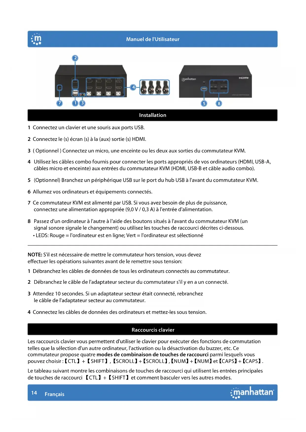 Français Manuel de l'Utilisateur Installation 1 Connectez un clavier et une souris aux ports USB. 2 Connectez le (s) écran (s) à la (aux) sortie (s) HDMI. 3 ( Optionnel ) Connectez un micro, une enceinte ou les deux aux sorties du commutateur KVM. 4 Utilisez les câbles combo fournis pour connecter les ports appropriés de vos ordinateurs (HDMI, USB-A, câbles micro et enceinte) aux entrées du commutateur KVM (HDMI, USB-B et câble audio combo). 5 (Optionnel) Branchez un périphérique USB sur le port du hub USB à l'avant du commutateur KVM. 6 Allumez vos ordinateurs et équipements connectés. 7 Ce commutateur KVM est alimenté par USB. Si vous avez besoin de plus de puissance, connectez une alimentation appropriée (9,0 V / 0,3 A) à l'entrée d'alimentation. 8 Passez d'un ordinateur à l'autre à l'aide des boutons situés à l'avant du commutateur KVM (un signal sonore signale le changement) ou utilisez les touches de raccourci décrites ci-dessous.