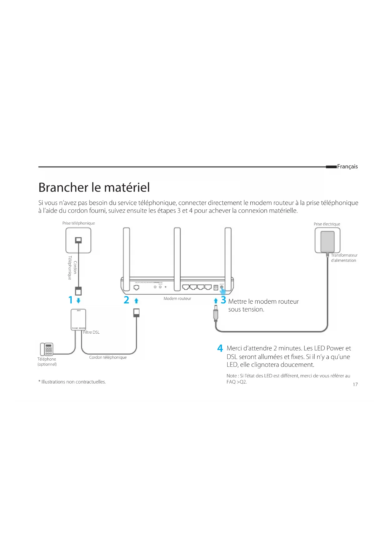 DSL LAN1 LAN2 LAN3 LAN4/WAN POWER POWERON/OFFWPS RESETWiFiON/OFF* Illustrations non contractuelles.Prise téléphoniqueCordon TéléphoniqueCordon téléphoniqueModem routeur Mettre le modem routeur sous tension. Prise électriqueTransformateur d’alimentationFiltre DSLTéléphone (optionnel)Note : Si l’état des LED est diérent, merci de vous référer au FAQ >Q2. Merci d’attendre 2 minutes. Les LED Power et DSL seront allumées et xes. Si il n’y a qu’une LED, elle clignotera doucement.Français