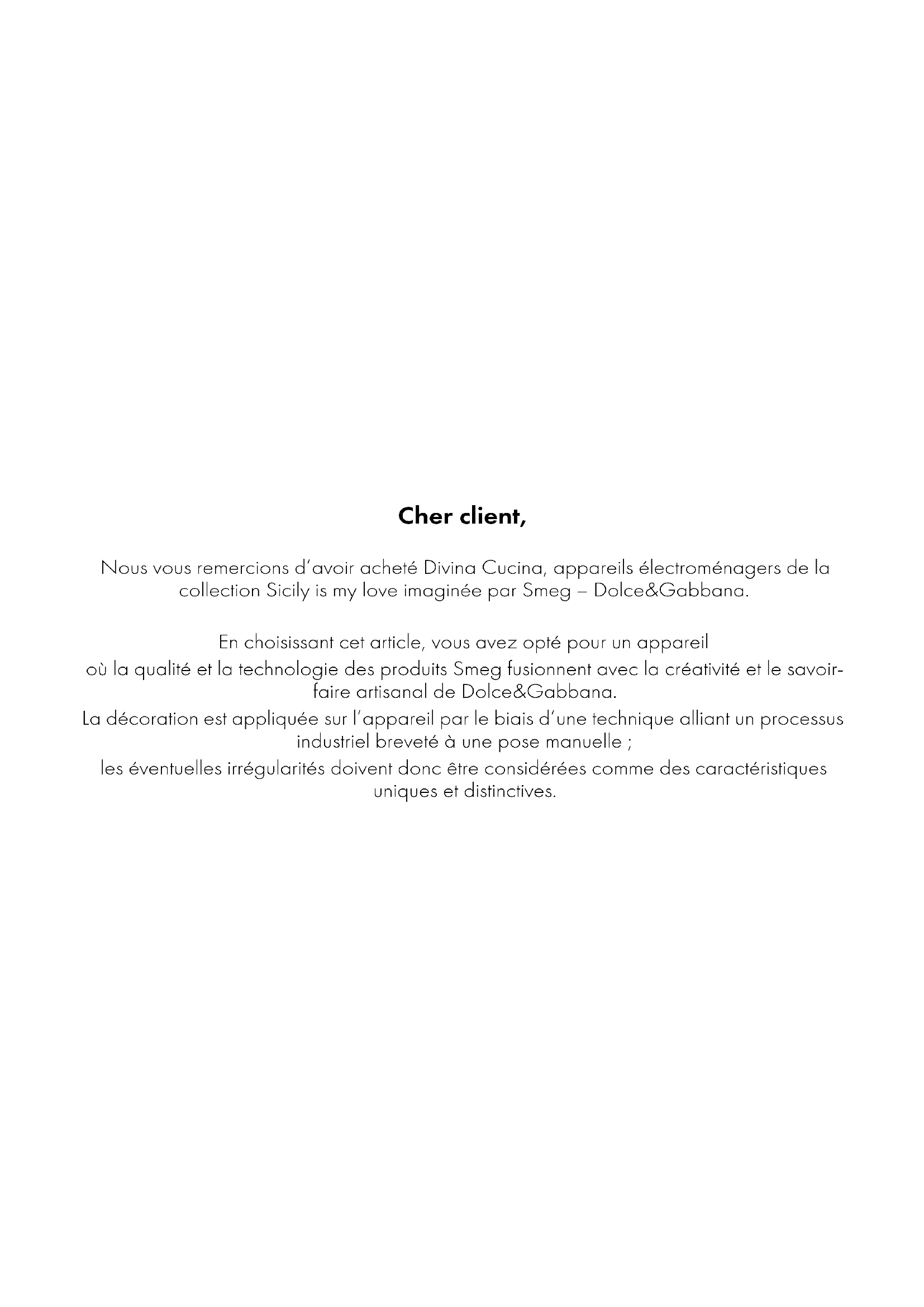 Cher client, Nous vous remercions d’avoir acheté Divina Cucina, appareils électroménagers de la collection Sicily is my love imaginée par Smeg – Dolce&Gabbana. En choisissant cet article, vous avez opté pour un appareil où la qualité et la technologie des produits Smeg fusionnent avec la créativité et le savoir- faire artisanal de Dolce&Gabbana. La décoration est appliquée sur l’appareil par le biais d’une technique alliant un processus industriel breveté à une pose manuelle ; les éventuelles irrégularités doivent donc être considérées comme des caractéristiques uniques et distinctives.113 Sommaire FRFR 1 Avertissements 114