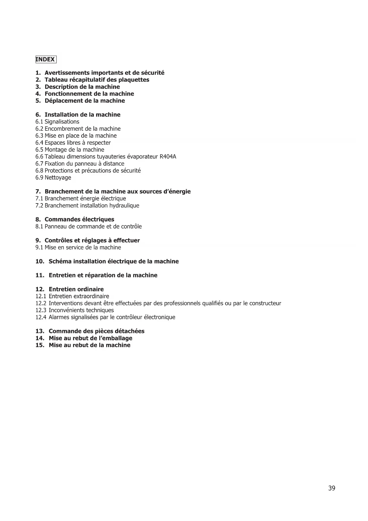 Nous énumérons ci-après les opérations d’entretien qui exigent une compétence technique spécifique et qui, par conséquent, doivent être effectuées par des professionnels qualifiés ou par le Constructeur. Pour aucune raison l’utilisateur ne devra effectuer: remplacement de composants électriques interventions sur l’installation électrique réparations de parties mécaniques interventions sur l’installation frigorifique